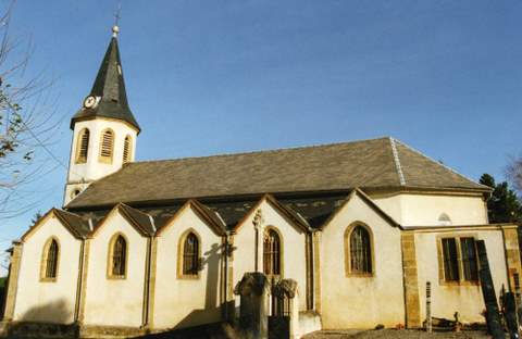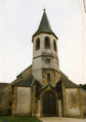 Cette grande église qui date du XVIe s. a été en grande partie reconstruite au XIXe siècle. Son plan se compose d’une nef flanquée de chapelles formant collatéraux au nord et au sud, d’une abside à pans coupés à l’est et d’un clocher hexagonal à l’ouest.