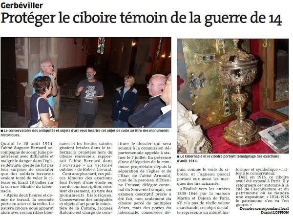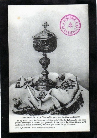 Ce ciboire a témoigné et témoigne encore des combats d’août 1914, qui détruisirent entièrement la commune de Gerbéviller, surnommée « Gerbéviller la Martyre ».