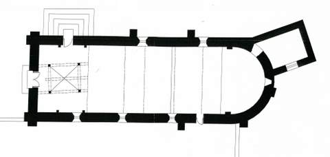 L’édifice a été construit au XIIe s. comme l’attestent, entre autres, les traces de trois anciennes petites fenêtres ; la baie d’axe seule vient d’être rétablie.