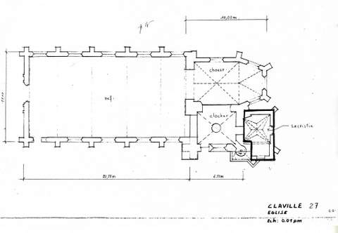 Claverii villa, la villa de Claverius….telle semble être, pour la fin de l’Antiquité ou le haut Moyen Âge, l’origine du toponyme Claville. Il est certain qu’au XIe s. existent déjà une communauté paroissiale et sans doute une église dont la dédicace à saint Martin atteste l’ancienneté. En 1183, Raoul du Bois-Hubert en cède le patronage ainsi que les dîmes à Rotrou, doyen du chapitre d’Évreux, donation confirmée l’année suivante par une bulle pontificale. Comme bon nombre d’églises normandes, celle de Claville fut ruinée pendant la guerre de Cent Ans et reconstruite aux XVe et XVIe s., en commençant sans doute par le chœur.