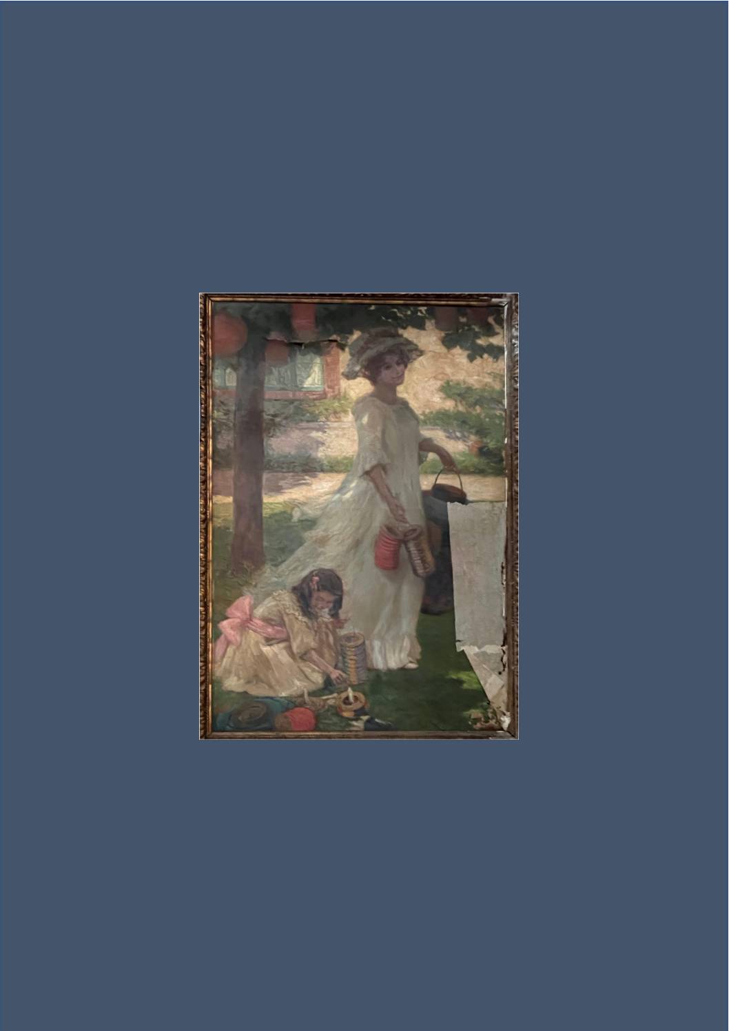 Ce tableau, probablement peint vers 1900, représente une jeune femme accompagnée d’une petite fille, toutes deux vêtues de blanc, arrangeant des lampions dans un jardin ensoleillé. Cette scène de plein air est placée sous le signe des festivités et du bon temps.