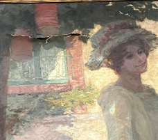 Acquis lors d’une vente de tableaux en lot par la Fondation Roguet, Jeune fille accrochant des lampions est aujourd’hui exposé dans une salle de l’Ehpad avec deux autres portraits. L’oeuvre est très endommagée et présente de nombreuses altérations, à la fois sur la toile et sur le cadre. Des mesures préventives ont été prises afin de limiter les dégradations – la toile a été nettoyée en 2005 par A. Bertrand et placée derrière un écran et sous des couvertures – mais aujourd’hui le tableau nécessite une restauration complète.