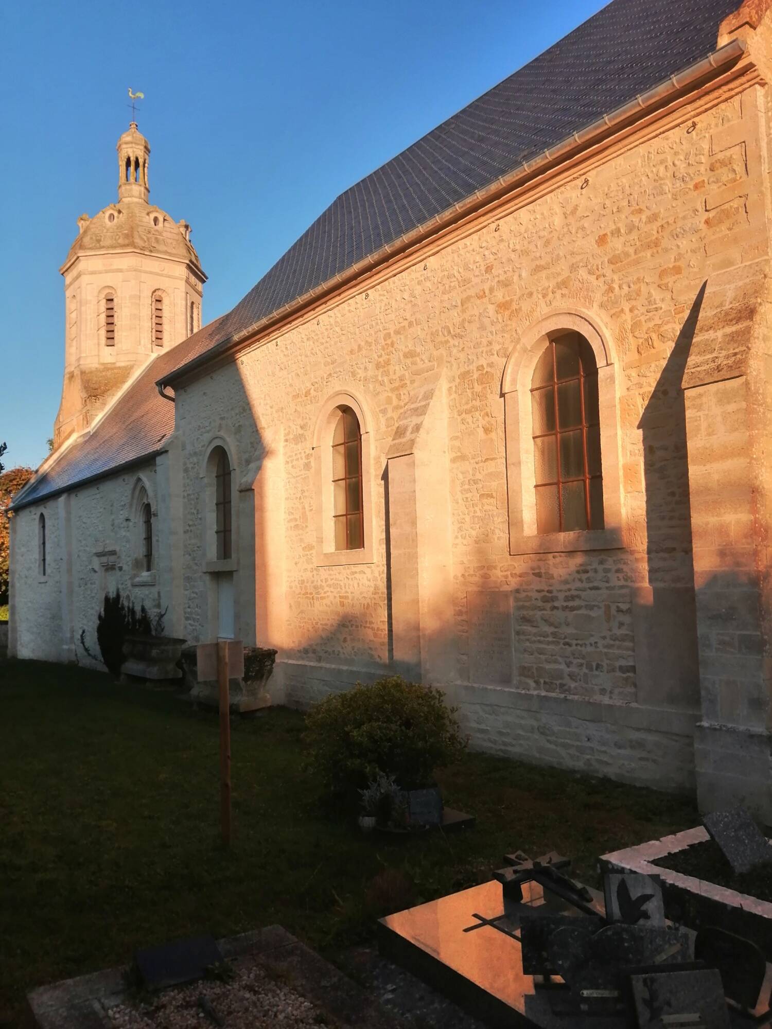 D’après une ancienne tradition, une église aurait existé autrefois dans la prairie à l’est, non loin du château actuel, le long de la voie romaine reliant Vieux à Bayeux. L’église actuelle ne serait à l’origine que la chapelle du château.