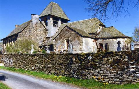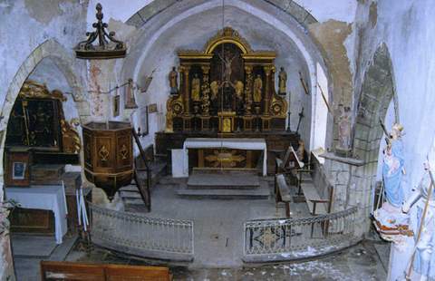 De l’édifice roman d’origine il ne reste au fond de la nef que deux colonnes engagées et tronquées du fait de l’édification tardive d’une tribune. Cette nef dessine un rectangle, légèrement déformé. Le chœur, voûté en cul-de-four, pourrait remonter aux XIIe et XIIIe siècles. C’est au XVe s. que, pour les besoins de la liturgie, on aurait muré la fenêtre axiale et ouvert latéralement deux fenêtres, dont seule subsiste celle du sud. On a ajouté au XVe s., de part et d’autre de la nef, deux chapelles formant transept. Celle du nord, dédiée à saint Martial, premier évangélisateur du Rouergue selon la légende, a une voûte en arc brisé. Celle du sud, dédiée à Notre-Dame de Pitié et originellement à saint Macaire, est un petit édifice du XVe s., à croisée d’ogives retombant sur des culots ornés de visages assez grossiers. Elle a servi de chapelle funéraire pour les seigneurs de Salgues. C’est ce qui explique diverses transformations (XVIIe s.), le relèvement du sol et par conséquent la position anormalement basse de la piscine.