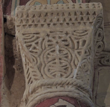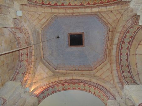La travée sous clocher est couverte d’une coupole octogonale sur pendentifs plats portée par des chapiteaux aux angles rabattus à motifs géométriques remarquables traités en méplat (la véritable curiosité de cette église consiste en ses 8 chapiteaux archaïques du carré sous clocher. Ils sont remarquables par leur décor en méplat tout en motifs géométriques variés : damiers, entrelacs, roues dentées, anneaux enlacés, etc … ). Elle est délimitée par des arcs en plein cintre. Une porte à linteau droit sur coussinet, placée en retrait dans son mur Sud sous une arcade recoupée par le pilier de la coupole, permet d’accéder à l’escalier en vis du clocher.