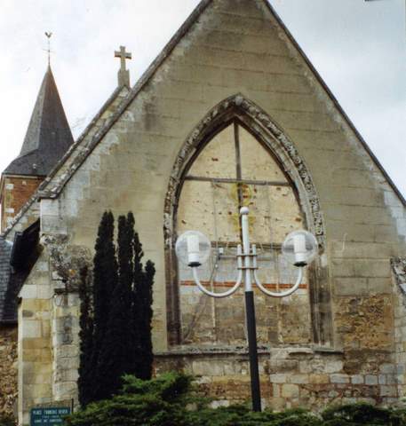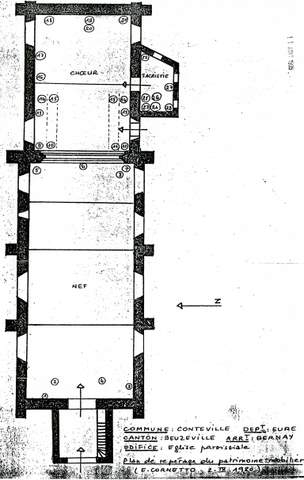 Dédiée à saint Maclou, l’église de Conteville dépendait de l’évêque de Dol-de-Bretagne. Son plan se caractérise par une nef de trois travées du XIIIe s. et un chœur en retrait à chevet plat reconstruit au XVIe siècle. La couverture est en ardoises. On accède à l’église par un clocher-porche bâti à l’ouest de la nef au XVIIIe siècle. Il est construit en appareil de briques et de pierres de taille, et coiffé d’une flèche polygonale. Une sacristie est accolée à la paroi nord du chœur. L’ensemble de l’édifice est couvert d’une voûte en bardeau soutenue par une charpente du XVe s. à l’ornementation soignée. L’arc triomphal à l’entrée du chœur est décoré d’un tore. Les trois baies en tiers-point du mur sud de la nef datent de la Renaissance: Parmi le mobilier, il convient de signaler les fonts baptismaux du XIIe s. ainsi que le maître-autel d’époque Louis XV surmonté de son dais à lambrequin. A proximité de l’église, un monument a été érigé en l’honneur de l’abbé Gilles François Rever de Beauvez (1753-1828), curé de la paroisse de 1784 à sa mort et l’une des figures les plus marquantes du département. En dépit des importants travaux de restauration menés en 1893 par Chavlon, architecte à Pont-Audemer, l’église de Conteville conserve encore un cachet particulier qui lui vaut de figurer dans le « Circuit des églises romanes du canton de Beuzeville ». En 1999, la Sauvegarde de l’Art français a accordé une subvention de 50 000 F pour la restauration du pignon ouest.