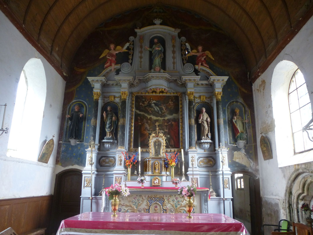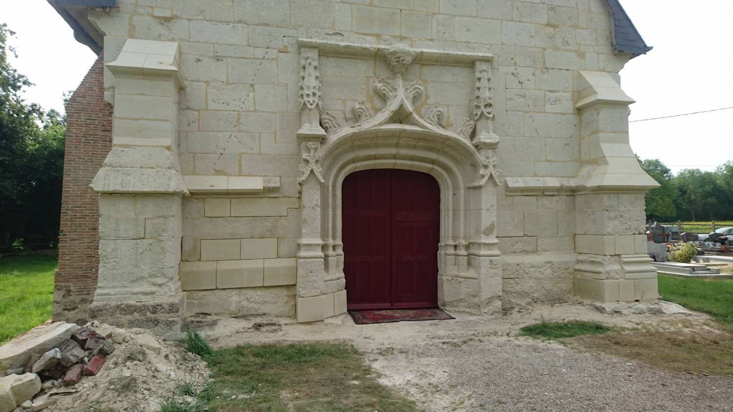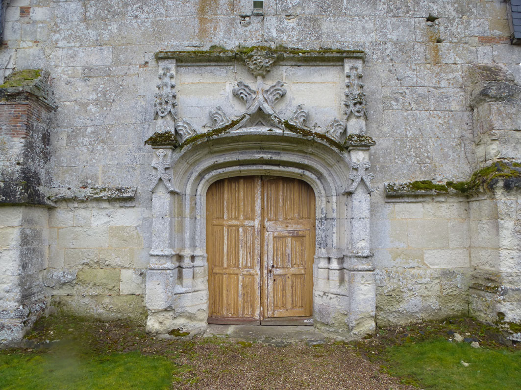 Une couverture pentue, en ardoises recouvre la nef qui est ornée en façade ouest d’un beau portail à arc surbaissé surmonté d’une accolade semée de feuille de choux frisés et surmontée d’un fleuron.