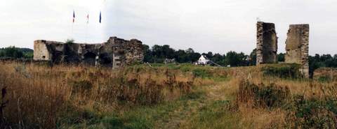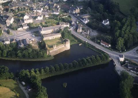 Le château de Corlay, mentionné pour la première fois en 1276, aurait été construit en 1195 par Henri de Corlay, selon la tradition. Il semble plus vraisemblable qu’il a été construit entre 1169 et 1247, par Alain III de Rohan, fondateur en 1184 de l’abbaye de Bon-Repos à laquelle il donne des terres à Corlay. Ruiné entre 1461 et 1471 au cours de la guerre de Cent Ans, le château est rebâti par Jean de Rohan de 1475 à 1493, par autorisation du duc de Bretagne François Il, confirmée par une lettre patente du roi Charles VIII, toutes deux en date du 23 décembre 1491. Il est construit en grand et moyen appareil de schiste et de granit, selon un plan quadrangulaire flanqué aux quatre angles d’une tour ronde, une cinquième tour défendant le portail d’entrée. Il est entouré à l’est et au nord d’un étang alimentant les douves qui l’entourent sur les deux autres flancs. Occupant un site stratégiquement important, la forteresse fut l’un des hauts lieux des guerres de la Ligue en Bretagne. Détenue par les troupes royales, elle fut en 1592 conquise par le duc de Mercœur, qui y mit en garnison des troupes espagnoles ; celles-ci réalisèrent de nombreux terrassements, probablement à l’usage de l’artillerie. Plusieurs fois pris et repris par les ligueurs et les royaux, le château était déjà en fort mauvais état, puisque l’un des planchers s’effondra au cours d’une réception donnée par le ligueur Guy de la Fontenelle, qui l’avait repris en 1594. Après la capitulation de ce dernier en 1595, au cours d’un siège mémorable, il fut maintenu au rang de capitainerie, mais sans garnison, et il fut démantelé en 1616. Laissé à l’abandon, le château sombra peu à peu en ruines : la tour du midi, dite tour de la Miséricorde, fut arasée au XVIIIe s. pour permettre la construction d’un logement pour le receveur de la châtellenie. Acquise par le département le 28 frimaire an VII (18 décembre 1798), la forteresse servit de carrière pour la restauration de l’église en 1806. Au XIXe s. y furent établis la gendarmerie et les haras, mais les fortifications restèrent sans entretien jusqu’au rachat par la commune en 1978. Depuis, un effort notable a été fait pour la mise en valeur des ruines et la réhabilitation des bâtiments : l’ancienne gendarmerie est aujourd’hui transformée en logements sociaux et les anciens haras abritent depuis 1989 une maison du cheval, une bibliothèque et des salles d’exposition et de réunion. Le château offre aujourd’hui une silhouette extrêmement mutilée : plus de la moitié de l’enceinte est irrémédiablement détruite, de même que la plupart des tours ; les douves ont été comblées. Les vestiges subsistants (tour nord-ouest, courtines, étang, portail d’entrée à double porte cochère et piétonne) rappellent encore cependant la splendeur passée et maints détails de construction évoquent une architecture caractéristique de l’extrême fin du XVe siècle. Le château ayant appartenu à la famille de Rohan, la Sauvegarde de l’Art français a accordé, à titre tout à fait exceptionnel, une aide de 50 000 F pour un remontage en stricte conservation de la partie écroulée du rempart (courtine et tour nord).
