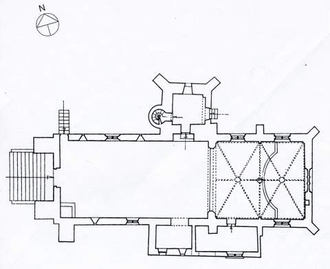Peut-être est-ce à la proximité de l’église Notre-Dame des Marais de la Ferté-Bernard que l’église Saint-Denis de Cormes doit sa silhouette élancée, plus citadine que rurale. Elle est dominée par un important clocher qui se compose d’une tour à trois niveaux séparés par un cordon en fort relief, et d’un ensemble en charpente et ardoises formé d’une chambre des cloches de section carrée et d’une flèche. On y accède par un escalier placé dans une élégante tourelle circulaire, couverte d’une toiture en poivrière. La tour est datée du XVIIe siècle. Le chœur de deux travées, à chevet droit, domine le volume de la nef non voûtée. Il est éclairé par de hautes verrières en arc brisé avec remplages flamboyants dont la construction, bien documentée, s’échelonne entre 1500 et 1544. La nef est éclairée par de hautes fenêtres à deux lancettes analogues à celles du chœur. Dans ses murs latéraux sont encore visibles de petites fenêtres étroites de type roman qui ont été bouchées et qui pourraient correspondre à l’église mentionnée dans un texte de 1096. La façade occidentale est percée d’une porte en anse de panier, à laquelle on accède par un haut emmarchement construit au XIXe s. pour compenser la déclivité de la rue. Elle est coiffée d’une archivolte reposant sur des consoles.