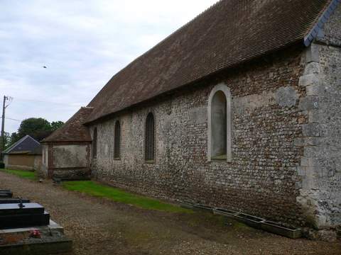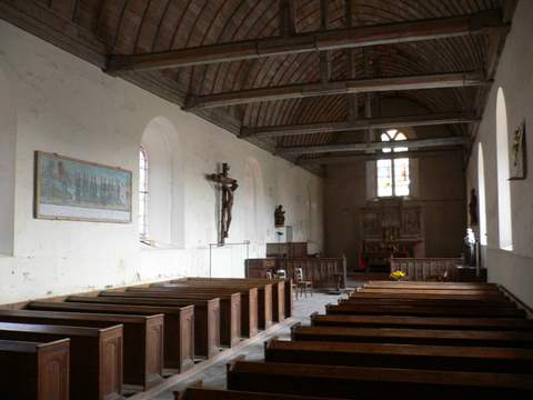 L’église est construite en moellons de silex et de calcaire, l’encadrement des ouvertures, qui datent du XIXe s., est en brique. Un clocher de bois s’élève au-dessus de la première travée, qui constitue une sorte de vestibule communiquant avec la nef par trois arcades tardives : cette première travée supportant le clocher est sans doute une addition, postérieure à la construction de la nef. L’intérieur de la nef est couvert d’une voûte en bois sur des entraits restés apparents ; le sol en petites tommettes, les bancs anciens conservés confèrent à l’ensemble une douce harmonie. Cet édifice très modeste conserve un peu de mobilier : le retable du maître-autel, un haut-relief en plâtre du XVIe s., représente trois scènes de la Passion. Les scènes latérales, sont dédiées à saint Sébastien et saint Gilles. Les vitraux à figures datent du XIXe s., celui de l’abside est divisé par un remplage de style XVIIe .