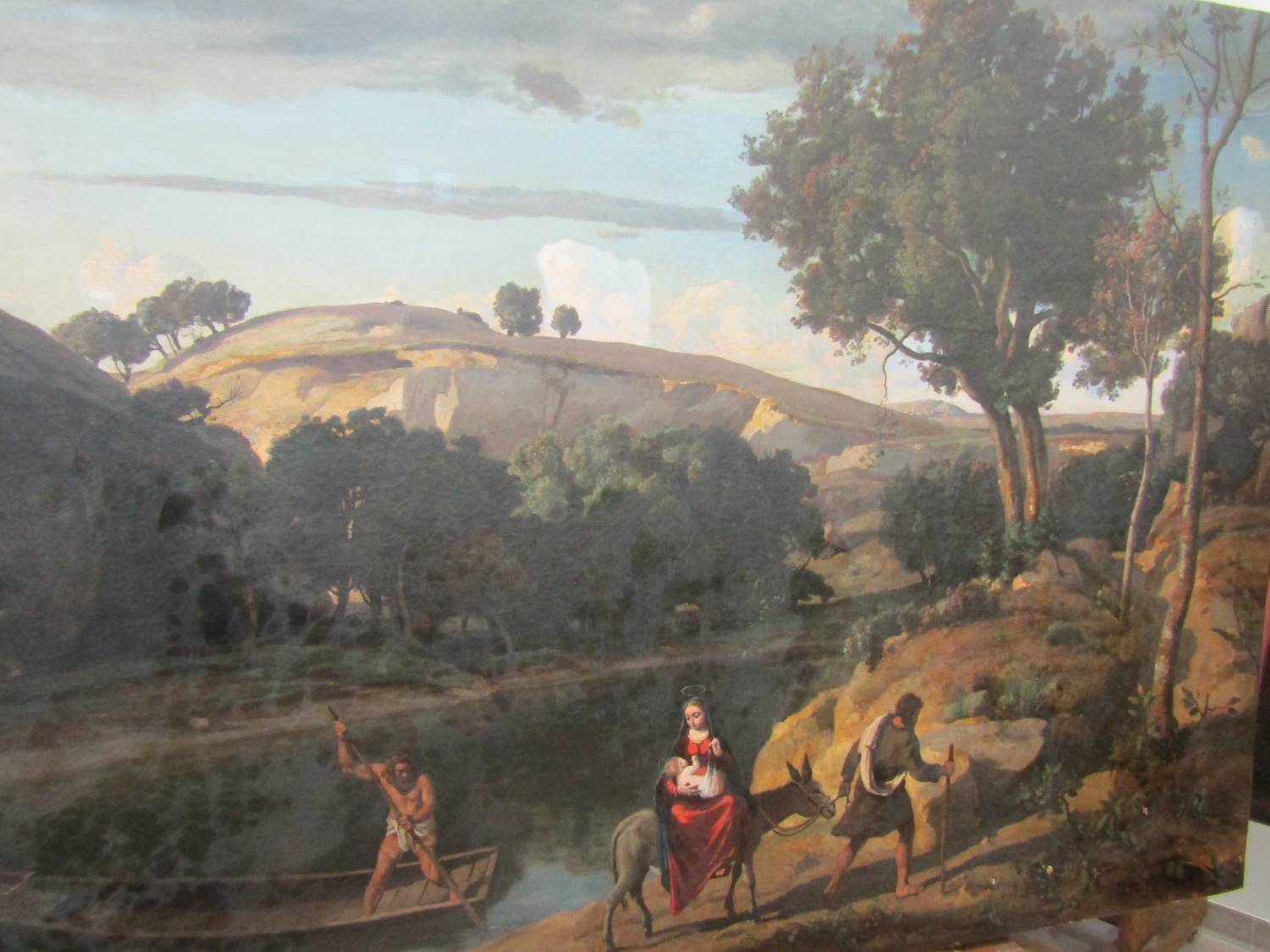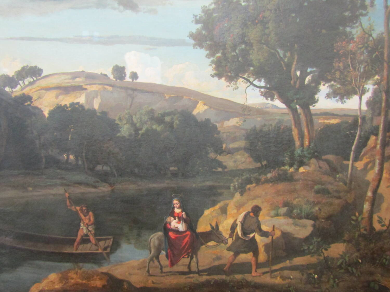 Cette scène biblique a été peinte en 1839 et présentée au salon de 1840. A partir de cette époque, Corot attire l’attention de ses contemporains. Ce paysagiste, réputé pour ses vues magistrales d’Italie, échappe pourtant aux écoles. Des »modernes » il tient son traitement réaliste des arbres et des rochers, alors qu’il s’attache obstinément aux thèmes néoclassiques. C’est en travaillant en plein air, notamment dans la forêt de Fontainebleau et à Barbison, que Corot va approfondir ses recherches sur la lumière et sa prédilection pour le paysage saisi sur le vif qui anticipent l’impressionnisme. Claude Monet dira en 1897 »Il y a un seul maître, Corot. Nous ne sommes rien en comparaison, rien ». Ses nombreuses études de paysages sont destinées à être réemployées dans des compositions plus ambitieuses, à caractère historique, religieux ou mythologique. Nous y voilà ! La Fuite en Egypte est une de ses œuvres totalement inédites qui font la renommée de l’artiste.