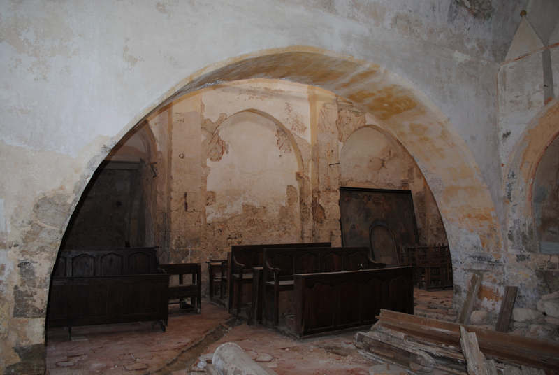 Petite église composée d’une nef unique de trois travées, voûtées en plein cintre et séparées par des arcs doubleaux supportés par des pilastres de base carrée. A l’est, la nef se prolonge d’une abside semi-circulaire voûté en cul de four. Une chapelle latérale accolée à la travée de choeur, voûtée et terminée par une abisdiole orientée. Au nord, ancienne entrée de l’église (qui se fait maintenant par l’abside). Un proche est accoté au nord de la première travée de la nef.