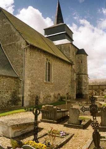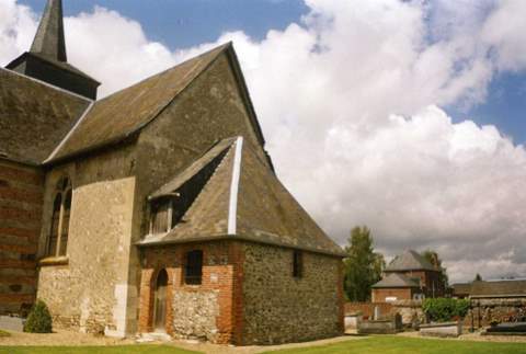 L’édifice, de plan rectangulaire, d’une trentaine de mètres de longueur, a été édifié en maçonnerie de silex. Il porte sur le mur nord de la nef des traces d’opus spicatum attestant une première construction du XIe ou du XIIe s., ce que vient corroborer la présence, dans le pignon occidental, d’une petite baie étroite en plein cintre, aujourd’hui murée. La nef est précédée d’un porche en pan de bois (daté de 1717). Le clocher, qui s’élève au milieu de la nef, est constitué d’une tour basse en maçonnerie flanquée d’une tourelle d’escalier en pierre de taille, datant du XVIe siècle et sommé d’une flèche de charpente. Le mur nord de la tour vient s’appuyer sur un fragment d’arc en plein cintre du XIe ou du XIIe s. qui pourrait être l’ancien arc diaphragme du bras nord du transept. Les baies de la nef ont été reprises en brique au XVIIIe siècle. Au XVIe s. avait été édifiée, à la jonction du chœur et de la nef (peut-être à l’emplacement du bras sud du transept), une chapelle construite en lits alternés de silex et de briques sur un soubassement en moellons de grès et de calcaire comportant, au nord, une large baie en plein cintre. Le chœur présente une structure identique à celle de la nef, étant éclairé sur chaque côté par une baie à remplage du XVIe siècle. Contre son chevet plat a été construite au XVIIIe s. une sacristie en brique et silex.