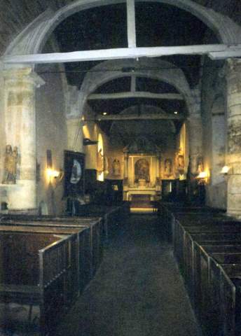 L’intérieur de la nef, à volume unique, aux murs enduits, est couvert d’une charpente lambrissée en berceau. Dans la travée qui précède le chœur, quatre forts piliers, très dégagés du mur, supportent le clocher. Un arc diaphragme sépare la nef du chœur, également lambrissé ; au sud s’ouvre la chapelle du XVIe s., voûtée sur croisée d’ogives.