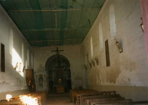 À l’intérieur, la nef est couverte d’une charpente apparente dont le lambris en mauvais état a dû être déposé, les ouvertures de la nef ont été agrandies intérieurement. La travée de chœur, légèrement plus étroite que la nef, est couverte d’une coupole sur trompes, elle supporte un clocher de charpente ; sur les murs nord et sud on note la présence, à un mètre au-dessus du sol, de petites arcatures. La voûte en cul-de-four est ornée d’un exceptionnel tétramorphe classé au titre des Monuments historiques. Ces peintures murales ont été datées par Madeleine Pré de la fin du XIIe ou du début du XIIIe siècle.