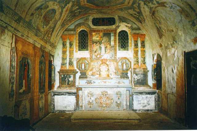 De nombreux saints populaires et guérisseurs sont présentés dans des encadrements simulés sur le mur nord et sur l’autel. Le mur sud, comme le quartier de voûte qui le surmonte, a perdu son décor à cause de l’humidité. Le tout cependant, outre son intérêt iconographique, a un grand intérêt esthétique. C’est un bel ensemble décoratif où le trompe-l’œil permet de remplacer matériaux et œuvres précieuses. Commandité par le seigneur de Courcelles, Charles de Birague, il avait été béni en 1656 par l’archevêque de Sens.