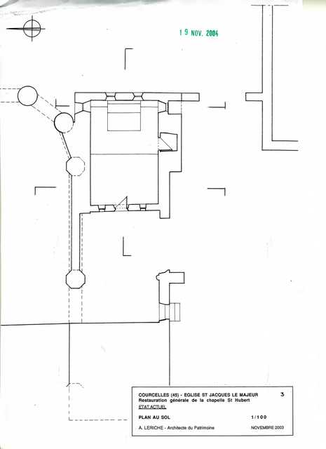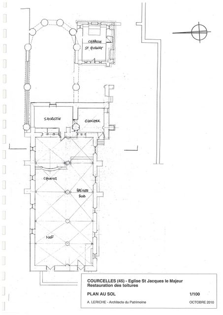 L’église dédiée à saint Jacques le Majeur se trouvait dans le diocèse de Sens, doyenné du Gâtinais, et relevait de l’abbaye de Saint-Benoît-sur-Loire. Son existence est attestée au XIIe s. et le mur gouttereau nord de la nef le confirme, même si des baies plus larges ont été ouvertes au XVIe s., mais des modillons romans ont été conservés. Cette nef à l’origine n’était pas voûtée d’où l’absence de contrefort au niveau des trois premières travées occidentales. La travée orientale de la nef et la première travée du chœur datent des XII-XIIIe s. et ont été modifiées au XVe siècle. Un bas côté au sud a été ajouté sans doute à l’occasion des grands projets de reconstruction et d’agrandissement. Les voûtes de la nef ne datent que du XIXe siècle. Un vaste chœur à déambulatoire et chevet pentagonal était prévu. Les travaux furent commencés aux alentours de 1400, sans doute sous l’impulsion du seigneur de Courcelles Jean de Braque ( † 1406), familier de Charles V, des ducs de Berry et d’Anjou, maître des Eaux et Forêts de Normandie, ou du moins par son fils Blanchet de Braque. La défaite d’Azincourt (1415) où Blanchet fut blessé et fait prisonnier interrompit complètement le chantier. Seuls ont été construits et subsistent les piles polygonales et les grands arcs brisés qui devaient contourner l’espace du chœur et l’ouvrir sur un déambulatoire. C’est dans cette partie droite du déambulatoire prévu qu’on a élevé d’une part à l’ouest, au XVIIe s., un clocher sans grand caractère appuyé sur le bas-côté sud, et plus à l’est la chapelle Saint-Hubert.