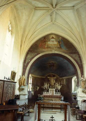 L’église paroissiale Saint-Nicolas, implantée sur les hauteurs du village de Courcelles remonte pour ses parties les plus anciennes au xve s., mais a connu d’importantes interventions aux époques ultérieures, notamment aux xvie et xixe s. L’établissement de plans datés de 1858 permet de connaître très précisément la nature de cette dernière campagne.L’édifice, de 36 m de long, comprend un clocher-porche monumental, une nef de trois travées et un chœur composé de deux travées droites se terminant par une abside couverte d’une voûte en cul-de-four. Le chœur est l’élément qui a le mieux conservé son aspect d’origine. Il a été couvert au xvie s. de voûtes d’ogives soulignées par un réseau de liernes et de tiercerons ; leur facture est élégante. On datera de la même époque les remplages flamboyants des baies du chœur. Des travaux, au xixe s., s’attachèrent à remanier profondément la nef et sa voûte, à surélever le clocher-porche et à réaliser des travaux de peinture intérieure.L’église, non inscrite, se trouvait dans un fort mauvais état de conservation quand le dynamisme de l’association de sauvegarde « Les Amis de Courcelles » permit d’entreprendre en 1984 la restauration de la façade et le déblaiement des alentours. La deuxième campagne de travaux pour laquelle la Sauvegarde de l’Art Français a accordé en 1987 une subvention de 30 000 F a été consacrée à la remise en état des murs gouttereaux et des contreforts nord.