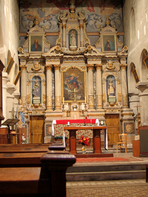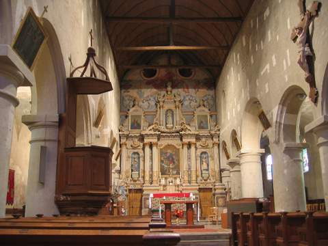 L’église présente une nef à trois vaisseaux sans transept débordant et un chapitrel, avec des voûtes d’arrêtes sur les bas-côtés et des voûtes lambrissées sur le vaisseau central. La tour-clocher hexagonale date du XVIIe siècle, hors œuvre. Le chevet est à pans coupés. Les murs sont en essentiellement en moellons enduits,et la couverture en ardoises.