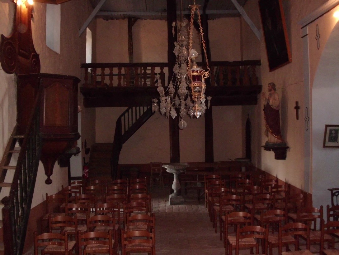 A l’intérieur de l’église, une tribune reposant sur des poteaux en bois donne accès à la trappe du clocher.