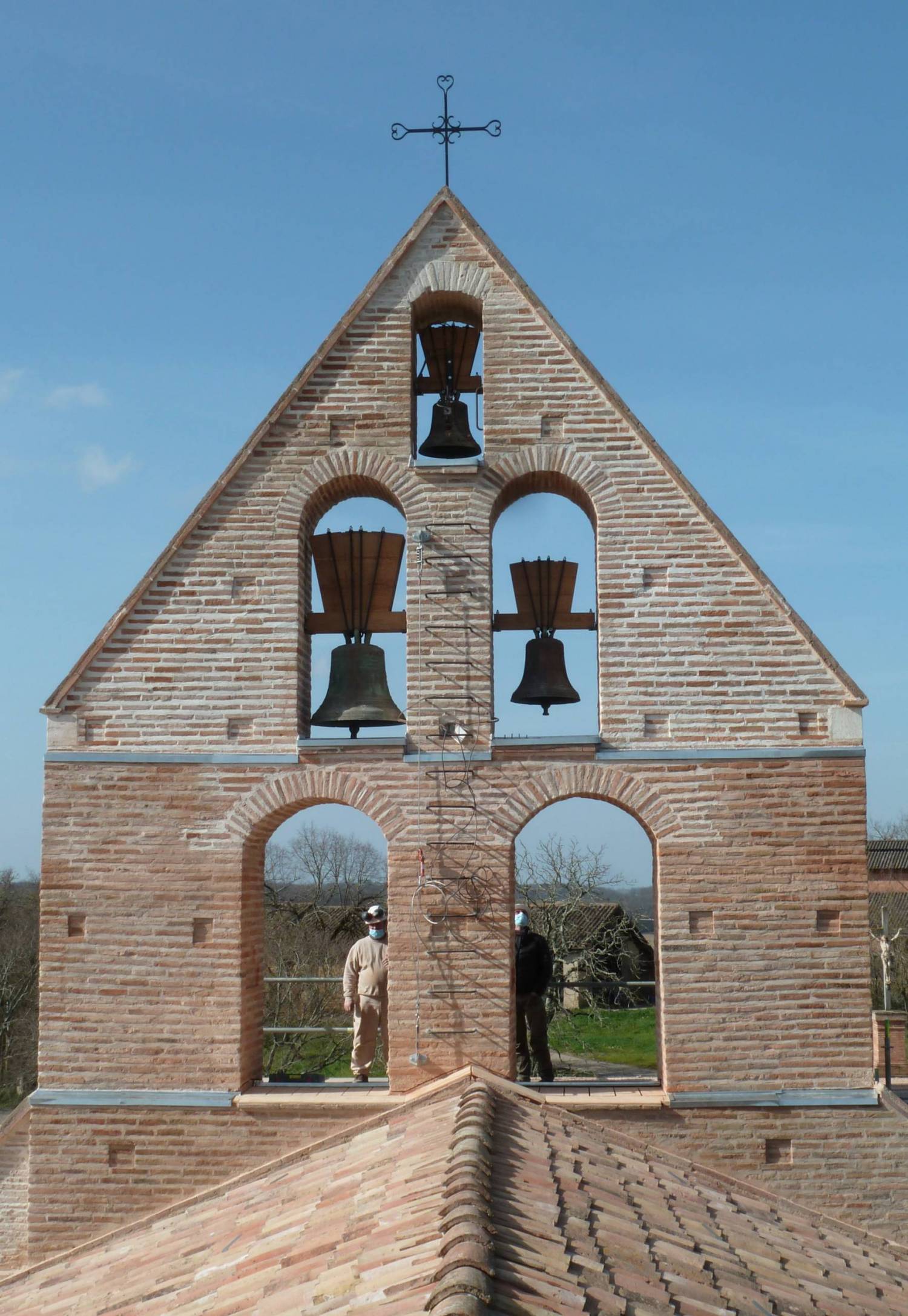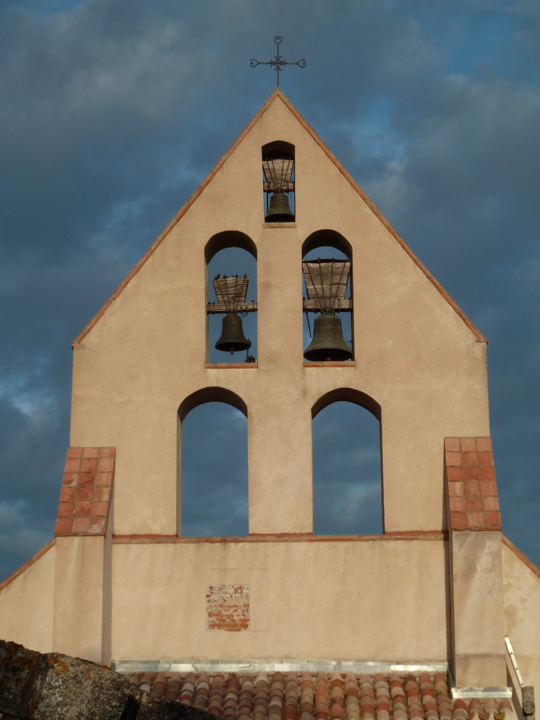 Au nord et à l’ouest, un auvent sur poteaux vient protéger les deux accès à l’église. Le clocher-mur est terminé par un pignon triangulaire, percé de 5 baies campanaires culminant à 14,60 mètres. La particularité de l’édifice est qu’il soit bâti au niveau de la nef et du choeur, de murs en terre massive avec un rehaussement en briques cuites. La chapelle sud et le clocher-mur sont construits en briques cuites, tandis que la sacristie l’est en briques crues. Enfin, les couvertures sont en tuiles canal.