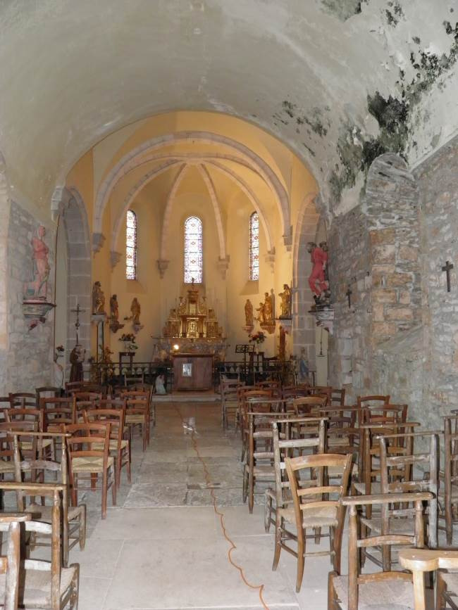 Un clocher de plan carré porté par deux consoles surmonte le pignon occidental. Une volée d’escaliers aménagé dans le mur ouest permet d’accéder à la chambre des cloches. La nef est voûtée en berceau et la croisée du transept, les chapelles et le chœur d’ogives. La nef et le clocheton sont couverts en lauzes et le transept et le chœur en ardoises.