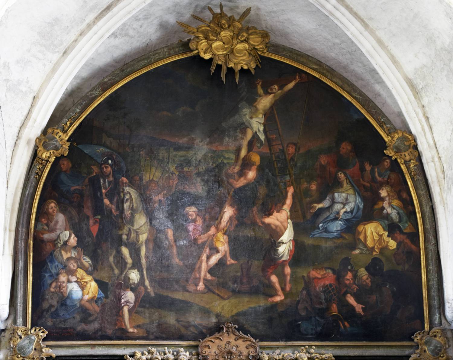 Un tableau monumental recouvre entièrement la partie supérieure du mur de chevet. Il représente l’Elévation de la Croix, épisode de la Passion du Christ. Ce thème n’a pratiquement pas été représenté en histoire de l’art, d’où l’intérêt du tableau de Crépon. Cette peinture du XVIIIᵉ siècle est mise en valeur par les boiseries de la même époque qu’elle vient couronner. L’œuvre est une excellente copie de Charles Le Brun exécutée en 1685 pour les appartements du roi à Versailles. L’original (bien plus petite que notre œuvre) est exposé au musée des Beaux-arts de Troyes. Il est probablement l’œuvre de plusieurs artistes, actifs dans l’entourage d’Eustache Restout (1655-1743), voir même de ce dernier. La restauration permettra d’en savoir plus.
