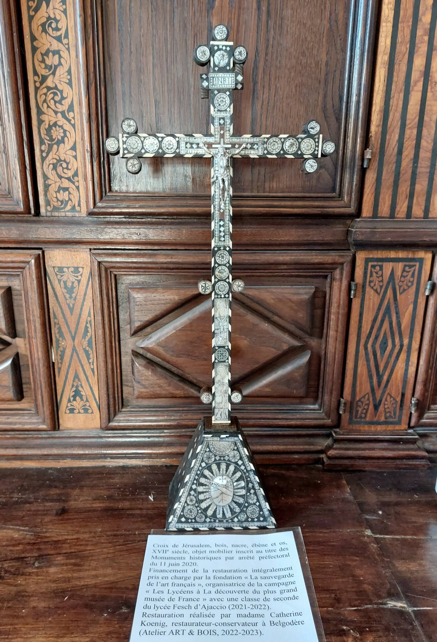 L’église de Bastelica regorge de nombreux trésors dont une magnifique croix d’autel dite de Jérusalem. L’effigie du Christ en croix, en métal, est un élément rapporté ultérieurement. Elle a été réalisée en bois, métal et en nacre. Elle date probablement du XVIIe ou du XVIIIe siècle. Depuis 2020, elle a été inscrite au titre d’objet.