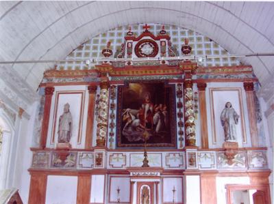 Le chœur, composé de trois travées, présente cinq fenêtres (deux au nord et trois au sud) qui datent du XVIIIe siècle. Mais le pignon n’a jamais été percé pour recevoir des vitraux. La voûte est plus basse que celle de la nef, dont elle est séparée par une poutre de gloire métallique. Ce fut en effet la mode au XIXe s. de scier les entraits en bois ou de les remplacer par des tirants métalliques, qui ont généralement affaibli la structure, afin de dégager la vue sur le chœur et son retable (cl. 4).