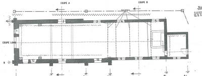 L’édifice, de plan rectangulaire sans transept, a une longueur totale de 29,5 mètres, si l’on inclut la sacristie. Il est en pierres de taille calcaire avec des ajouts de silex (cl. 1).