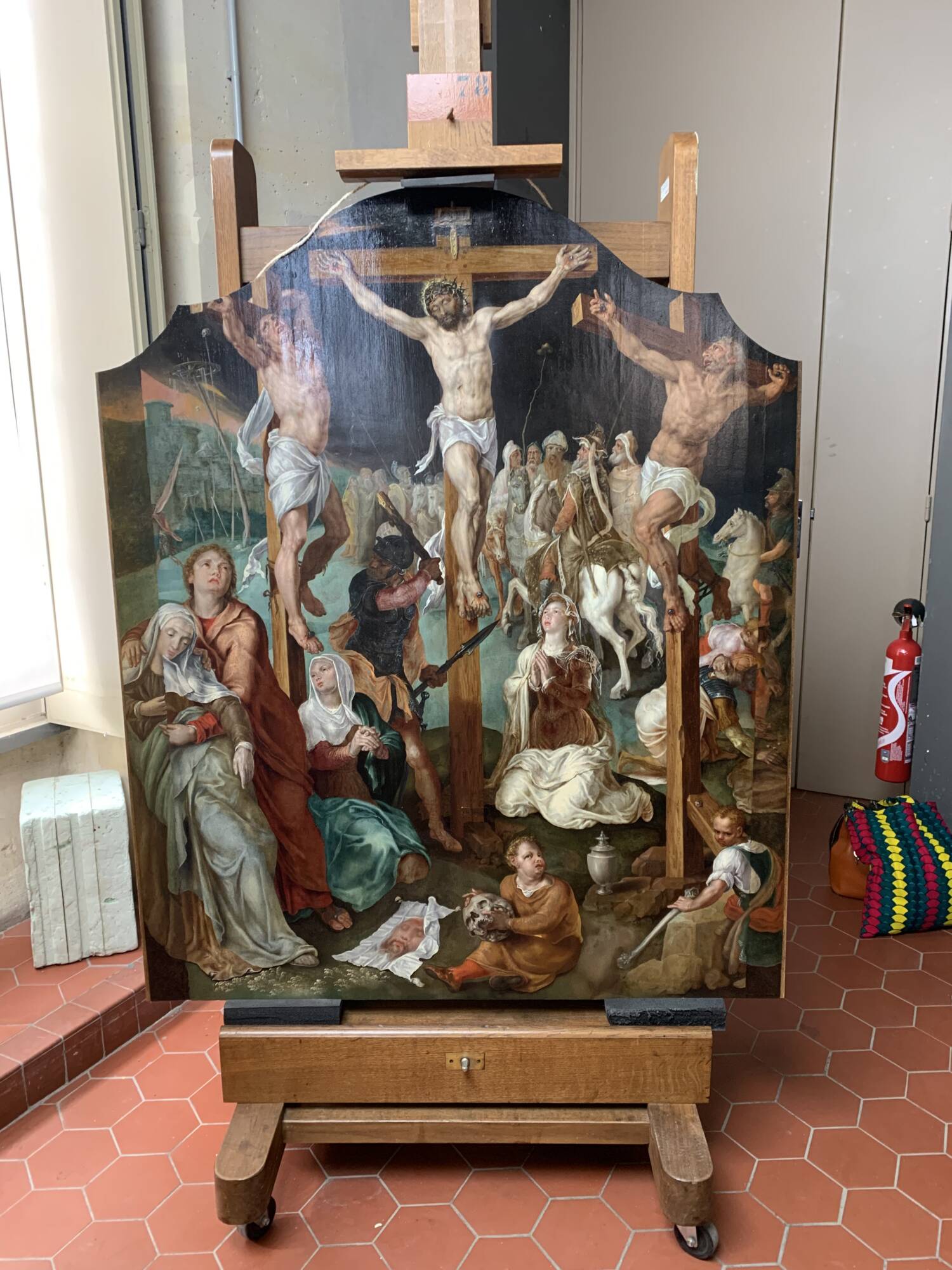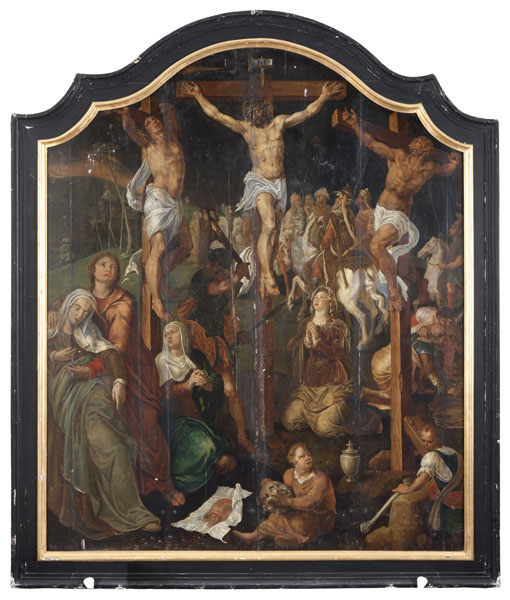 Martin van Heemskerck fait un voyage en Italie dans les années 1530, il étudie les antiques, il dessine d’après Michel-Ange et puise dans l’œuvre de Jules Romain. Les premiers romanistes tels que Bernard van Orley, Jean Gossaert ou Jan van Scorel, utilisaient dans les années 1520-1530 des éléments antiques et s’inspiraient de la peinture italienne. Mais Martin van Heemskerck est le premier, dans les années 1540-1550, à assimiler pleinement ces formes italiennes antiques et Renaissance permettant de forger un art maniériste purement nordique. Les corps musculeux et la pause contorsionnée du mauvais larron sont hérités de la terribilità michelangelesque et du maniérisme italien de cette première moitié du XVIème siècle. Les Saintes Femmes éplorées et saint Jean se tiennent du côté du Christ et du bon larron tandis que les soldats romains jouent la tunique du Christ aux dés dans la partie droite du panneau. Au premier plan, une Vanité rappelle la brièveté de la vie humaine. Le visage du Christ en souffrance est imprimé sur le voile de sainte Véronique.
