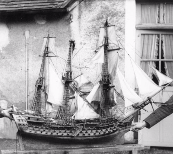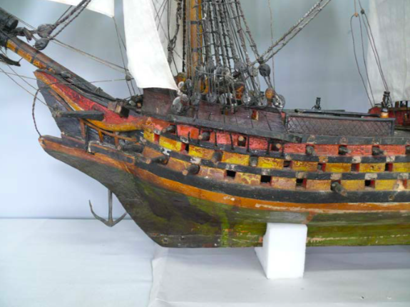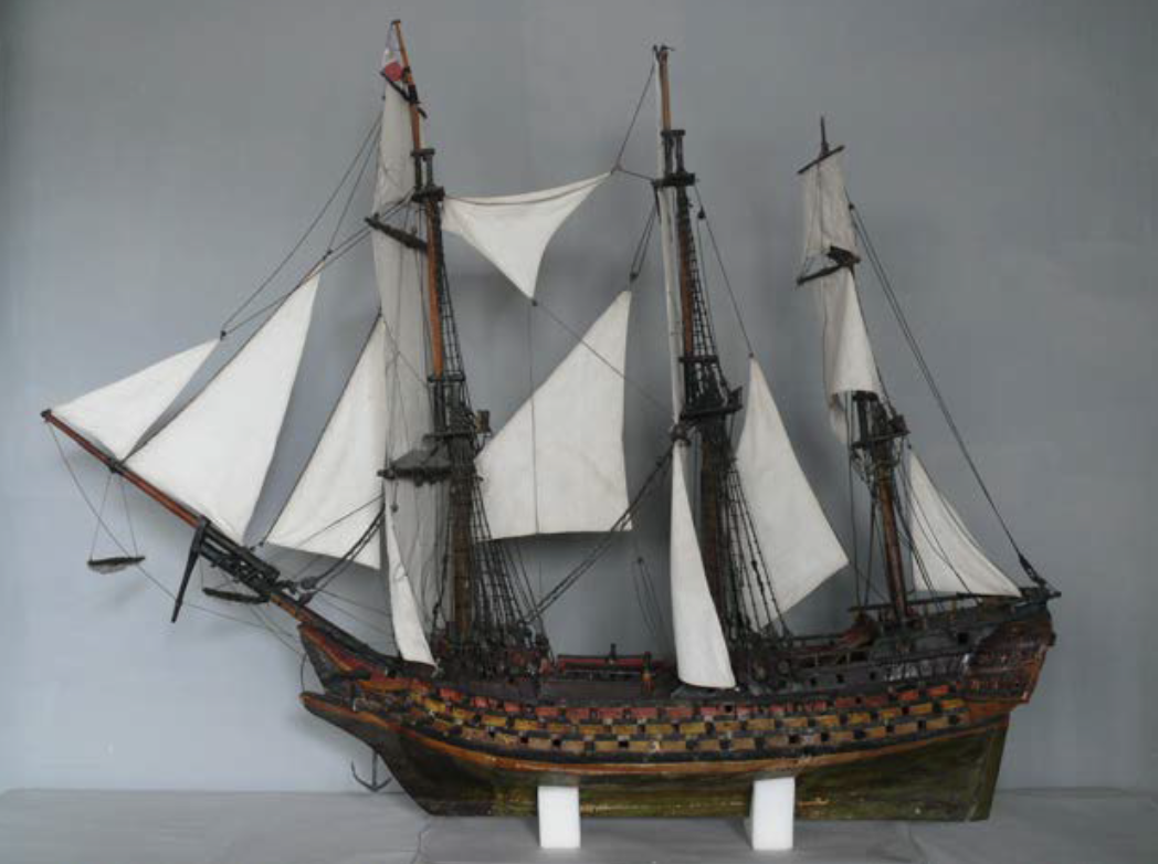 Grâce au don de la Fondation d’Entreprise Michelin, la maquette a été restaurée. Ce généreux mécénat a permis de couvrir la part du financement à la charge de la commune. La restauration a concerné en particulier la coque et le gréement. En effet, le bateau a été décrassé, toutes les parties mobiles sont bien recollées, les fentes du bois altéré ont été comblées. La coque, elle, a été dévernis et des retouches ont été opérées sur les lacunes de polychromie. Enfin, la maquette a bénéficié d’un traitement insecticide et fongicide préventif.