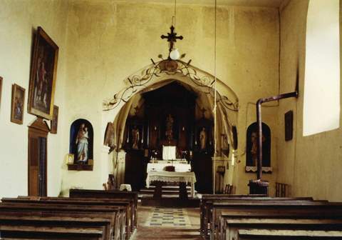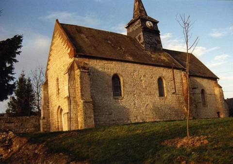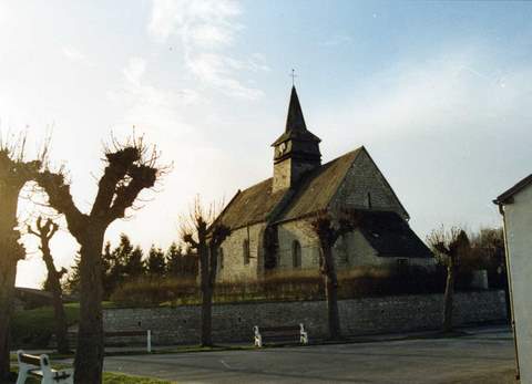 Avant la Révolution, le petit village de Cuirieux appartenait à l’abbaye de Bucilly. Il est donc probable que l’église Sainte-Geneviève, dont la construction remonte au XIIème s., s’est trouvée dans l’obédience de cette abbaye. Elle est aujourd’hui église paroissiale et est inscrite à l’Inventaire supplémentaire des Monuments historiques. Bien que de qualité architecturale certaine, c’est un édifice modeste aux volumes simples : un rectangle de 26,60 m de long. La partie la plus intéressante est le chœur où se trouvent deux chapiteaux assez étonnants dont la corbeille, qui surmonte l’ensemble constitué par une colonne nichée au creux d’un pilastre plié, est dotée d’un décor difficile à définir : végétal ? animal ? humanoïde ?… Un tailloir à moulures creuses couronne le tout et reçoit la retombée de la voûte d’ogive qui descend très bas. La façade du XIIème s. est un mur-pignon découvert dont les rampants sont bordés d’une frise de briques soigneusement appareillées, formant chevrons, qui créent un étonnant contraste avec l’appareillage irrégulier des moellons. Deux contreforts l’épaulent aux angles. La porte en plein cintre est surmontée d’une fenêtre également en plein cintre. Une tour-clocher carrée couverte d’une toiture pyramidale, terminée par une flèche de charpente, surmonte la croisée du chœur. Pour la réfection de la toiture de l’église et du clocher, la Sauvegarde de l’Art Français a accordé une subvention de 50 000 F en 1990.
