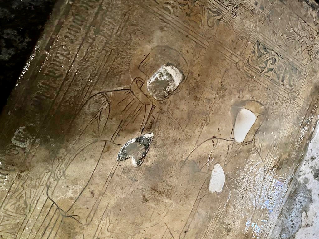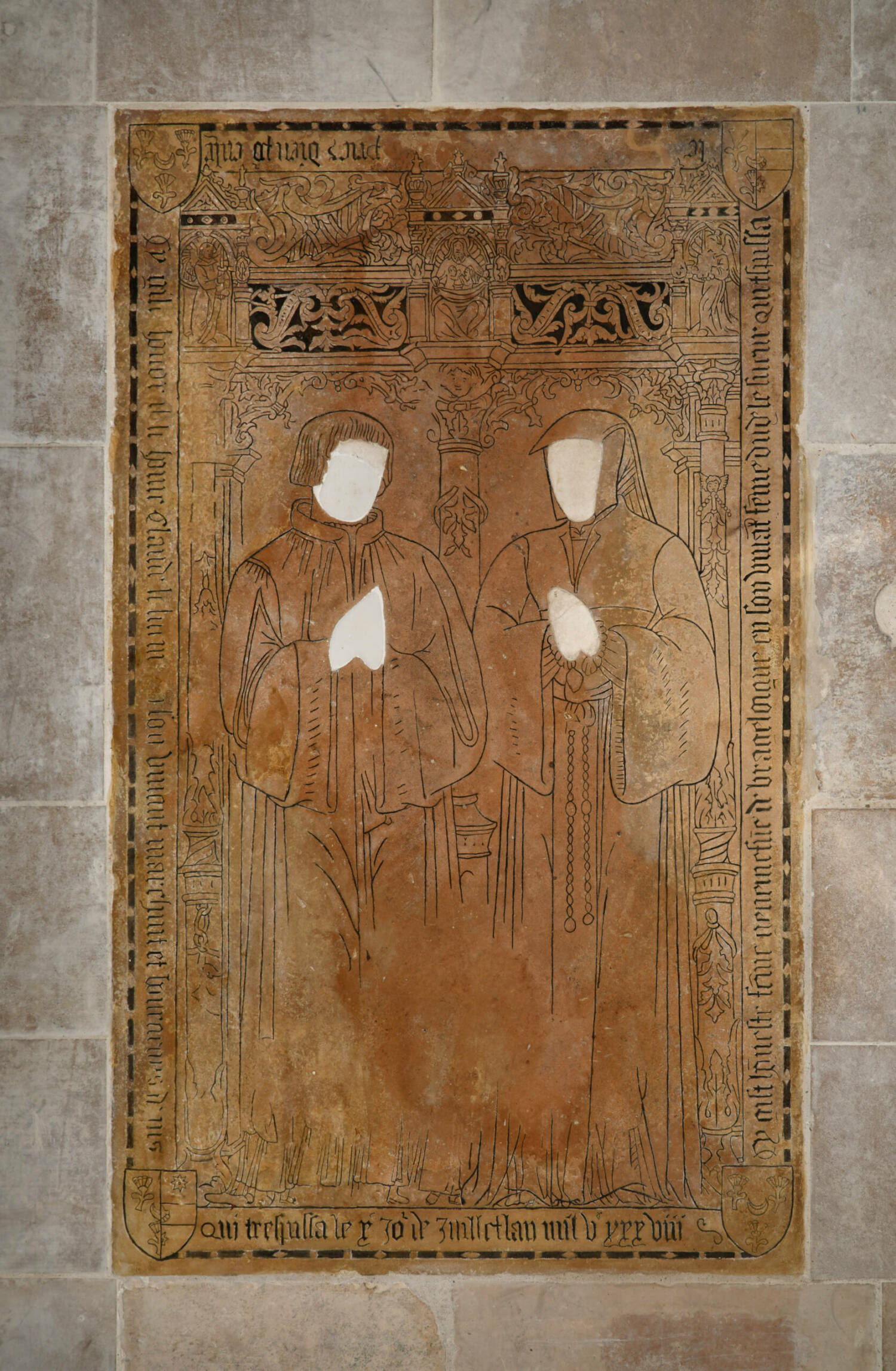 Une dalle funéraire est une plaque posée au-dessus d’une sépulture, enchâssée dans le dallage d’une église. Elle porte souvent une épitaphe ou une effigie gravée. Cette dalle funéraire a été découverte récemment lors de la dépose du parquet. Elle représente Guillaume le Sueur et son épouse, respectivement décédés en 1535 et 1522. L’ensemble est fait de pierre, les mains et les visages sont en marbre incrusté. Les phrases suivantes sont inscrites : « cy gisent noble maitre Guillaume le Sueur, en