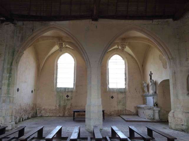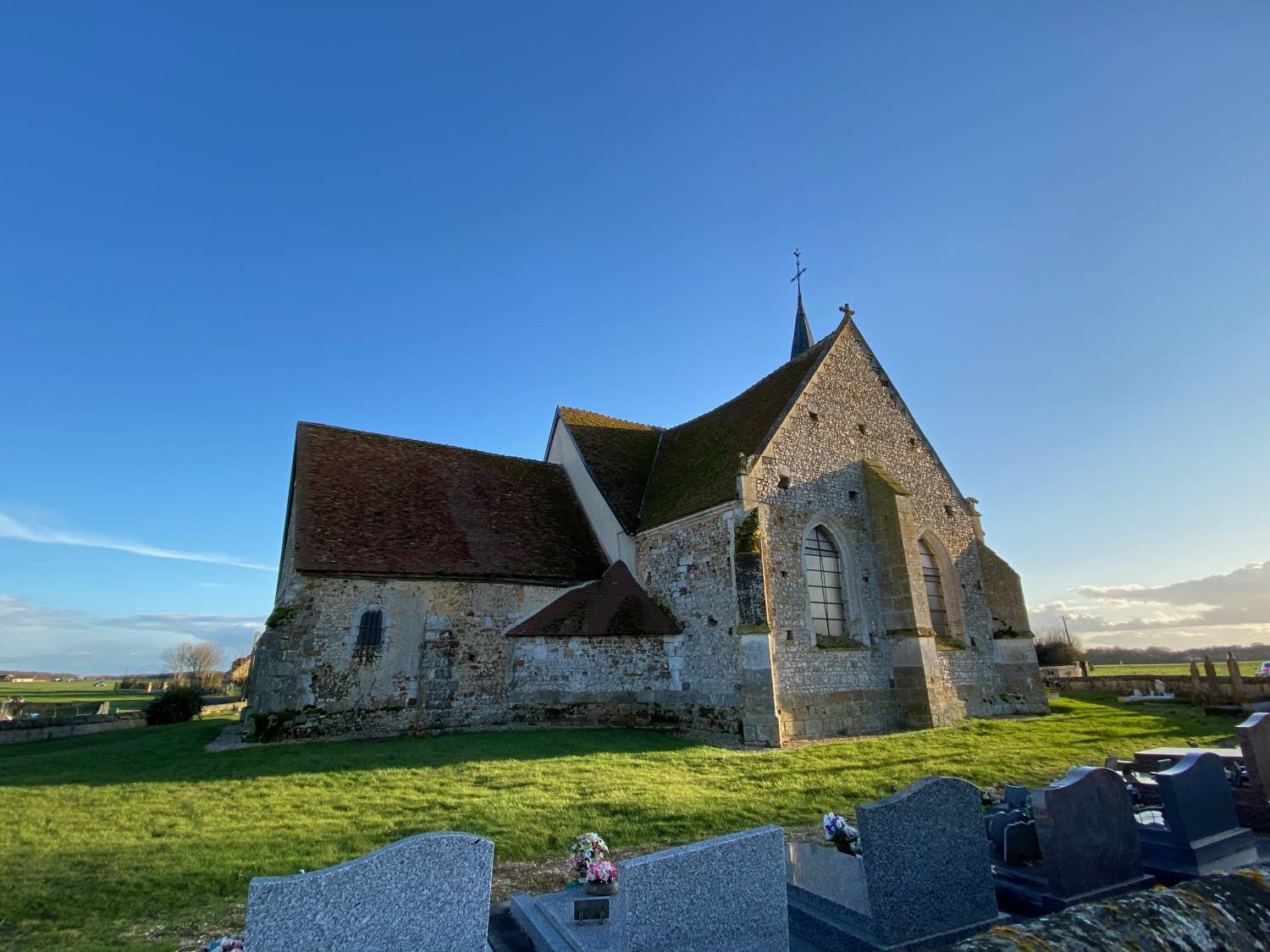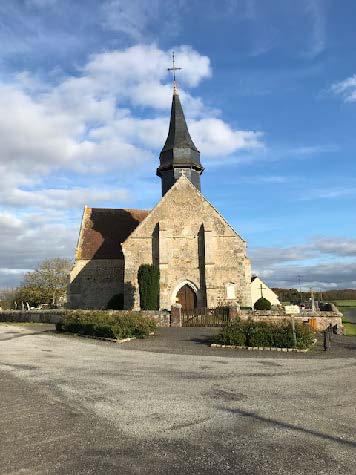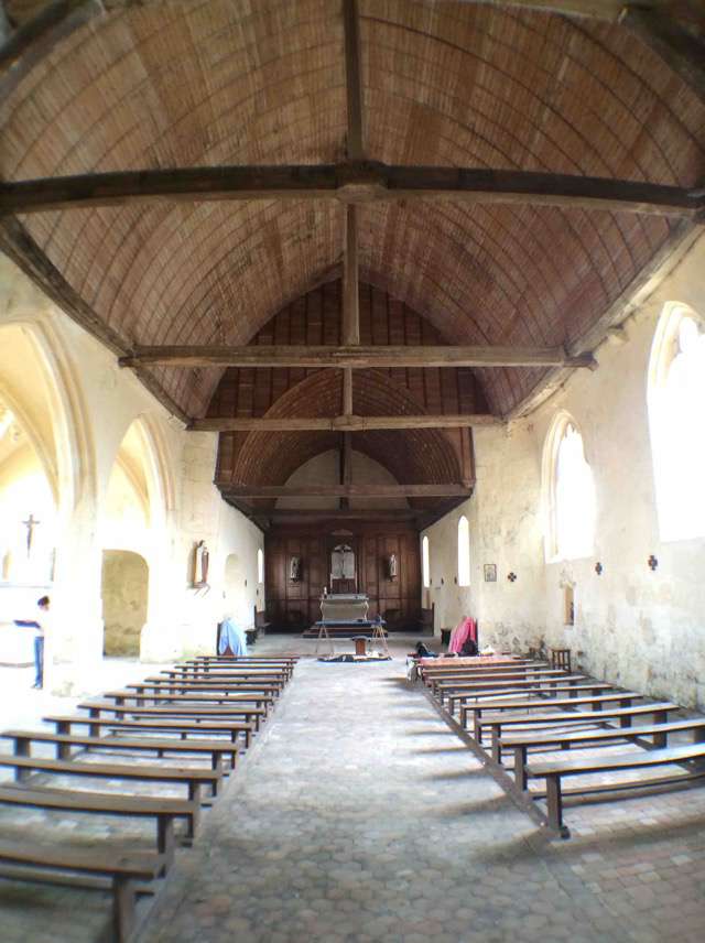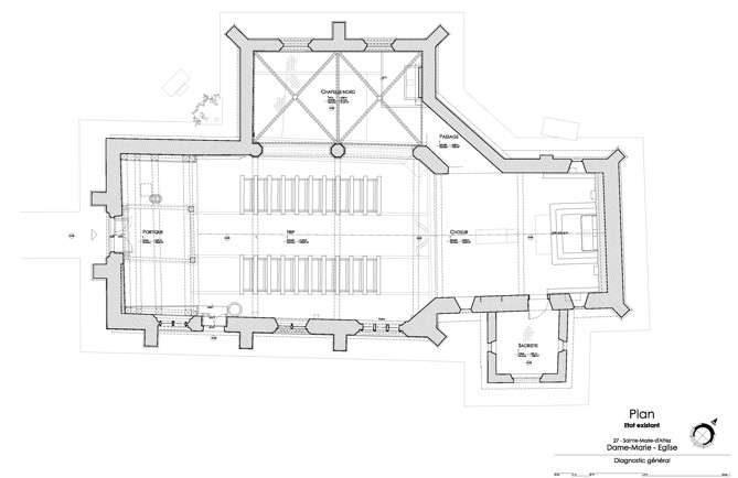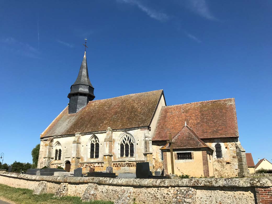Dame-Marie, Notre-Dame, le patronage de l’église comme le nom de la paroisse sont placés sous l’invocation de la Vierge. Au début du XIIIe s., la présentation à la cure est passée de l’abbé du Bec à l’évêque d’Évreux. L’édifice actuel se compose d’une nef de plan rectangulaire, coiffée d’un clocher à courte flèche et prolongée par un chœur plus étroit. Comme ce fut souvent le cas en Normandie, l’édifice ancien (XIe-XIIIe s. ?), ruiné pendant la guerre de Cent Ans, fut reconstruit au XVIe siècle. En témoignent notamment le mur sud de la nef, avec ses contreforts et sa petite porte latérale sous arc à tympan. Les fenêtres, visiblement repercées et élargies, ont reçu des remplages de type flamboyant. L’apport essentiel fut l’adjonction au nord d’une chapelle construite en petit appareil régulier ; le mur nord de celle-ci est épaulé de deux contreforts d’angle, un contrefort central séparant deux baies en tiers-point, aux remplages sectionnés. La petite corniche moulurée du sommet du mur gouttereau évoque bien une construction du XVIe siècle. L’intérieur de l’église comporte deux volumes successifs, celui de la nef et celui du chœur. Les deux charpentes, en berceau brisé lambrissé, reposent sur des sablières hautes portées par des corbeaux de pierre. La chapelle nord est séparée de la nef par deux arcades moulurées en tiers-point. Son couvrement est assuré par une croisée d’ogives simple prenant appui, du côté de la nef, sur des piliers et, du côté nord, sur des culots sculptés. La croisée retombe en partie centrale sur une élégante clef pendante à décor de feuillage.