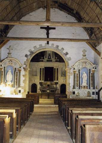 Seules les impostes de l’arc triomphal ont un profil en doucine. Des aisseliers renforcent les quatre entraits. Une lumière abondante éclaire l’église : les neuf baies sont dotées de vitraux à six panneaux chacun, de verre transparent, de même module carré. Les murs sont recouverts d’un enduit avec finition par application d’un badigeon au lait de chaux. Cette architecture vise avant tout la mise en valeur du mobilier.