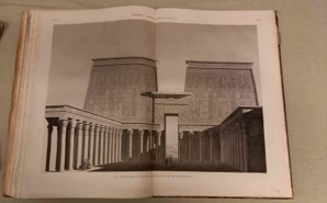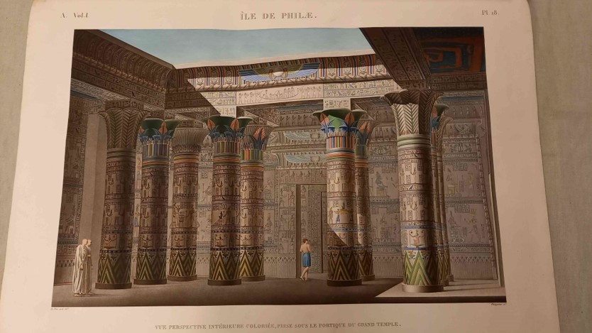 Ces ouvrages retracent l’expédition militaire menée par Bonaparte en Egypte. Commencée en 1798, cette expédition sera une succession de batailles gagnées, mais aussi de défaites, et aboutira à la capitulation en 1801. 167 savants ont ainsi réalisé une étude des multiples aspects de l’Egypte ancienne et moderne. Outre les textes, près de 900 planches et 3 000 dessins ont été élaborés sans oublier un volume constitué de cartes géographiques. La quantité et la précision des informations fournies surpassent tous les travaux publiés jusqu’alors. Les monuments sont relevés et décrits avec un souci de précision étonnant. N’oublions pas que bon nombre d’édifices représentés sur ces planches ont été détruits par la suite. Cette « Description de l’Egypte » est une source documentaire irremplaçable, même encore de nos jours.