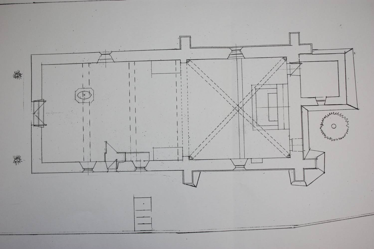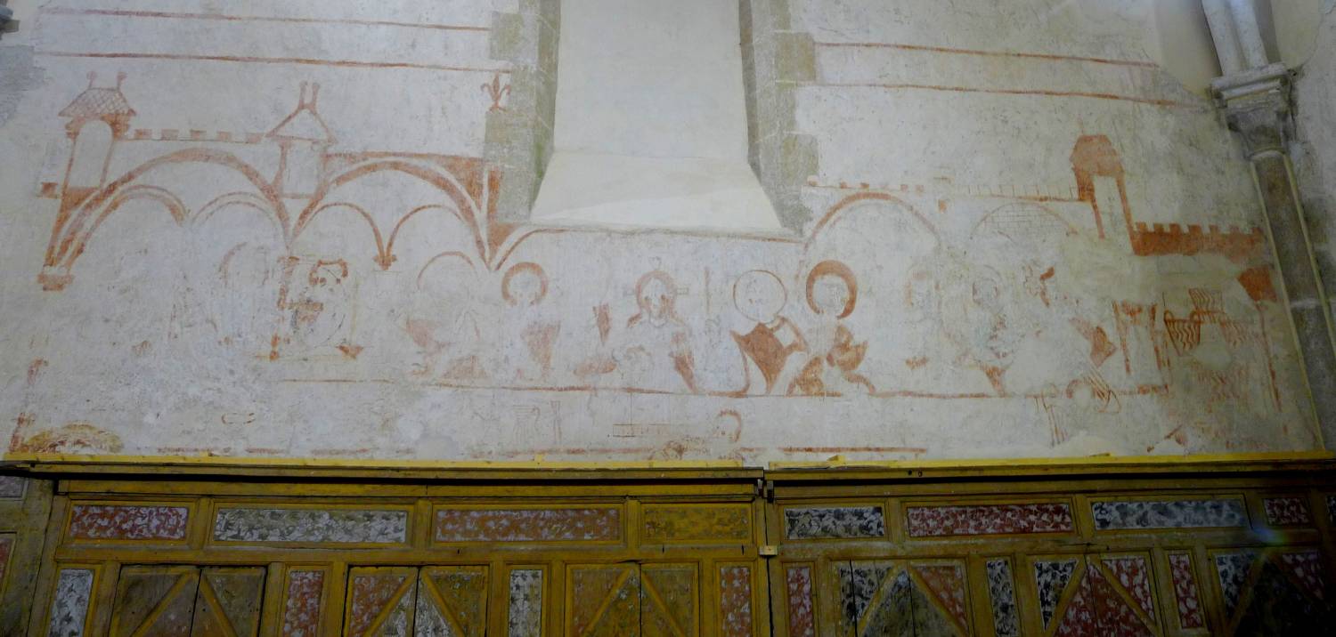 Des croix de consécration, inscrites dans des cercles tracés au compas et régulièrement espacées, ont d’abord été posées sur l’enduit primitif. Exécutées, comme le reste, à la détrempe sur un badigeon de chaux écru, elles ont été, peu après, intégrées à un décor qui n’occupe, respectivement, que la moitié ou le tiers inférieur des murs nord et sud. Assez bien conservé, le sujet représenté dans le registre supérieur de la peinture du mur nord est parfaitement identifiable. Il s’agit de la Cène, le dernier repas du Christ, épisode qui condense deux moments capitaux de la Passion : l’annonce de la trahison de Judas et l’institution du sacrement de l’Eucharistie. Dans le droit fil des peintures murales romanes où ce sujet est fréquemment repris, la scène est traitée de manière frontale et les effets de perspective sont quasi inexistants. Les convives sont rassemblés sur l’un des côtés d’une table garnie de mets, de plats et de pichets, sous des arcades voûtées d’ogives et une enceinte crénelée, hérissée de tours. De grands paniers à deux anses, sans doute chargés de pains, s’observent, en contrebas, à une extrémité, devant ce qui s’apparente à une porte d’enceinte. Reconnaissable au nimbe crucifère entourant son visage, le Christ, au centre, est représenté de face. Les apôtres auréolés qui l’entourent sont répartis en groupes. Ils semblent tout à la fuis incliner la tête pour exprimer leur affliction et s’interroger mutuellement sur l’identité du traître annoncé par Jésus. Deux d’entre eux, à l’extrême droite du spectateur, renversent leurs gobelets remplis de vin à l’écoute de cette annonce, comme pour marquer leur surprise. Un autre, placé à la gauche du Christ, appuie sa tête sur son épaule. Il doit s’agir de saint Jean. A cette exception près, l’identification précise des apôtres, dont celle de Judas, demeure problématique.