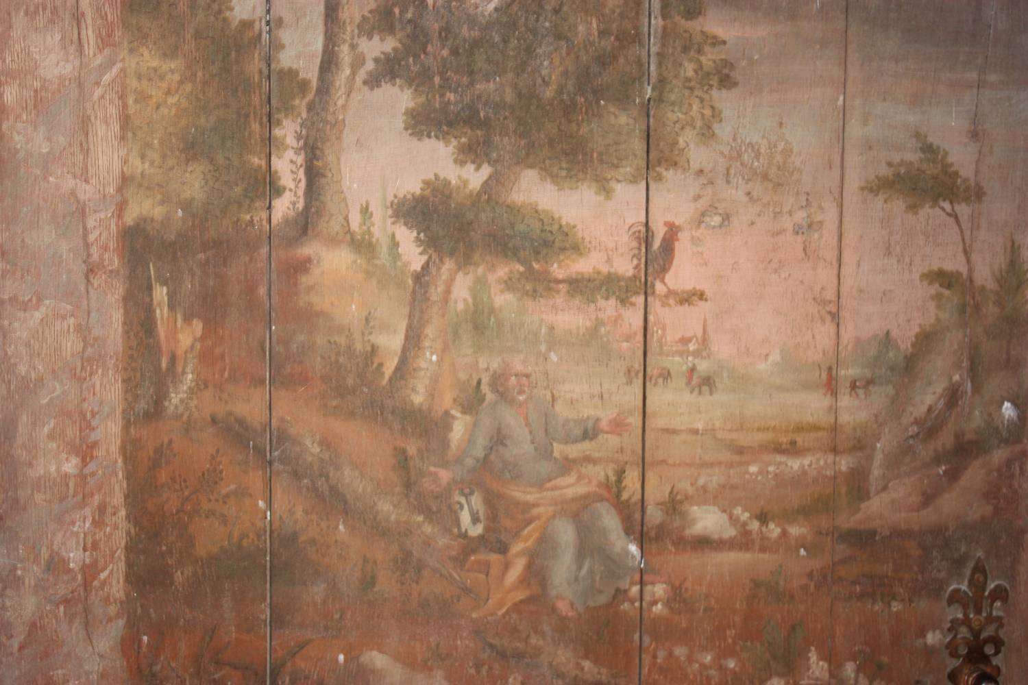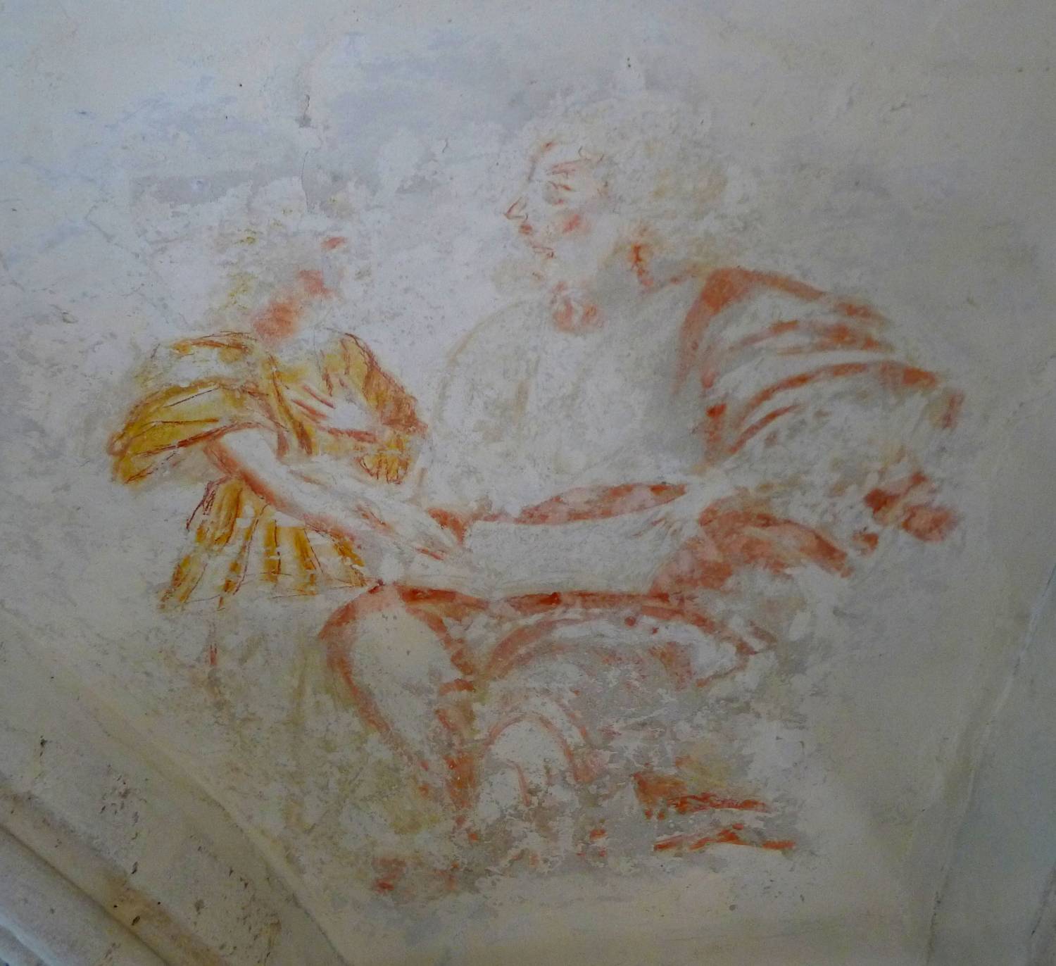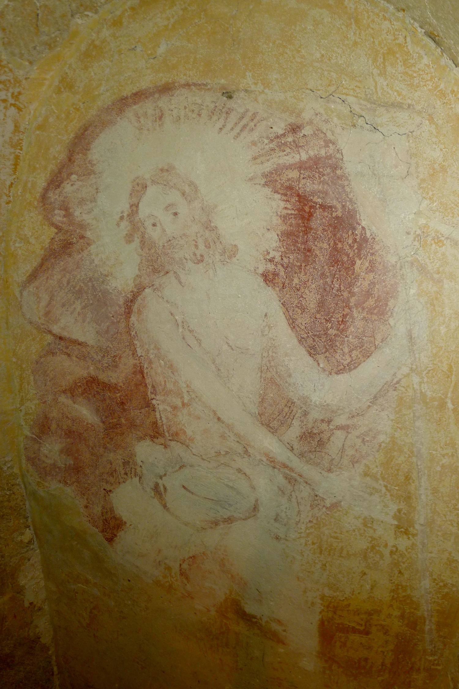 Exécuté lui aussi à l’ocre rouge, un décor peint ornemental et répétitif d’une grande simplicité, contemporain de la Cène, occupait, sous celle-ci, le registre inférieur du mur nord, ainsi que l’unique registre du mur sud. Conservé à l’état de vestiges, il consiste, dans le premier cas, en un motif à base de losanges et, dans le second, de fleurs stylisées à quatre pétales. D’une tout autre nature, le décor architecturé peint, en trompe-l’œil, sur le mur du chevet, avait pour fonction de magnifier l’autel majeur. Il a été posé en complément du retable qui le surmonte et date, sans aucun doute, de la même époque. Plus fragile, il n’est que très partiellement conservé. Les pigments colorés mis en œuvre sont un peu plus variés ; s’ajoutent à l’ocre jaune, majoritaire, et à l’ocre rouge, de la terre verte, par exemple dans les vêtements des deux personnages (dont l’un, au nord, est ailé et semble tenir une lance) qui se font face au-dessus d’une balustrade, de part et d’autre du retable. On note aussi l’emploi, dans le dessin, de la sanguine. Un Christ de la Résurrection, tenant un étendard, a été réalisé en totalité avec cette technique dans la fenêtre axiale, bouchée, du triplet. En outre, un évangéliste était conservé dans deux des quatre retombées de la voûte, peintes lors de la même campagne : saint Marc, tenant un livre et assis sur son attribut, le taureau, au nord ; saint Matthieu, identifié par l’ange qui se tient à sa droite, au sud. Ajoutons enfin, pour être complet, que les scènes figurées peintes sur les deux portes en bois latérales ont été également restaurées à l’occasion de cette tranche de travaux, qui a bénéficié en 2017 du soutien financier de la Sauvegarde de l’Art français.