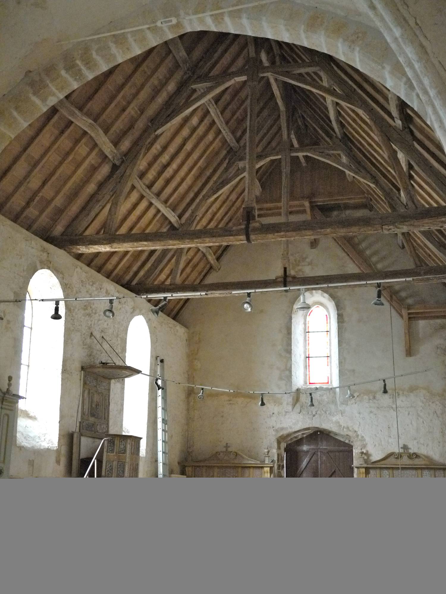 La restauration s’est appliquée à améliorer la lisibilité de ces décors, sans omettre de traiter, au préalable, les pathologies reconnues. Ainsi, les réparations de fortune ont été purgées, les lézardes colmatées au mortier de sable et de chaux, et les enduits fragilisés et en voie de désolidarisation renforcés par injection, à la seringue, d’un coulis de chaux. De même, les contaminations biologiques ont été traitées et la couche picturale consolidée. Le badigeon blanc qui la recouvrait a été éliminé au scalpel ou à la spatule, et les lacunes ne posant aucun problème d’interprétation ont été réintégrées à l’aquarelle, dans une teinte légèrement plus claire. En grande partie repris au XIXe siècle (une inscription, gravée dans le frais, indique qu’il a été « fait par Poirier Blondel»), l’enduit de la voûte, défectueux, devait être renouvelé. Les maçons ont procédé à son piochage avec beaucoup de prudence, parvenant à préserver les plages d’enduits anciens qui subsistaient encore. Cela en parfaite harmonie avec les restaurateurs, qui ont parachevé leur travail en recouvrant les parties refaites à neuf d’un badigeon d’harmonisation.
