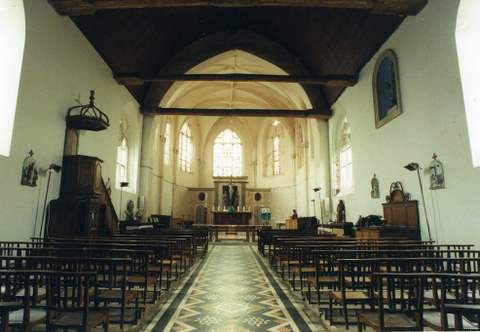 La nef est un vaisseau simple en moyen appareil régulier, scandé par des contreforts. Dans les murs gouttereaux, les percées sont symétriques au nord comme au sud : dans la première travée, la fenêtre est petite et en plein cintre ; la deuxième travée est aveugle ; dans la troisième, la baie est plus grande et en arc brisé ; dans la quatrième, juste avant le chœur, la fenêtre en deux lancettes surmontées de soufflets et de mouchettes est de la fin du XVe siècle. Curieusement il n’y a aucun accès du côté ouest où le mur de moyen appareil se poursuit régulièrement ; l’entrée se fait dans la deuxième travée nord par une porte simple et en plein cintre. À l’intérieur, la voûte est un berceau de bois avec entraits et poinçons apparents. L’ensemble est généralement daté de la fin du XVe siècle.