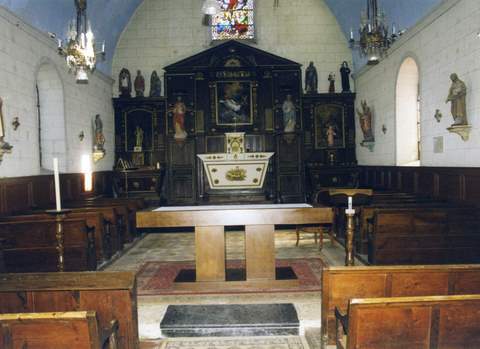 Le clocher en charpente couvert d’ardoise s’élève sur la première travée de la nef. Le lambris en forme de carène qui couvre le vaisseau repose sur des sablières ponctuées de têtes sculptées aux expressions savoureuses qui pourraient remonter au XVIe siècle. Ce sont les seuls éléments décoratifs dans une église caractérisée sinon par sa grande sobriété.