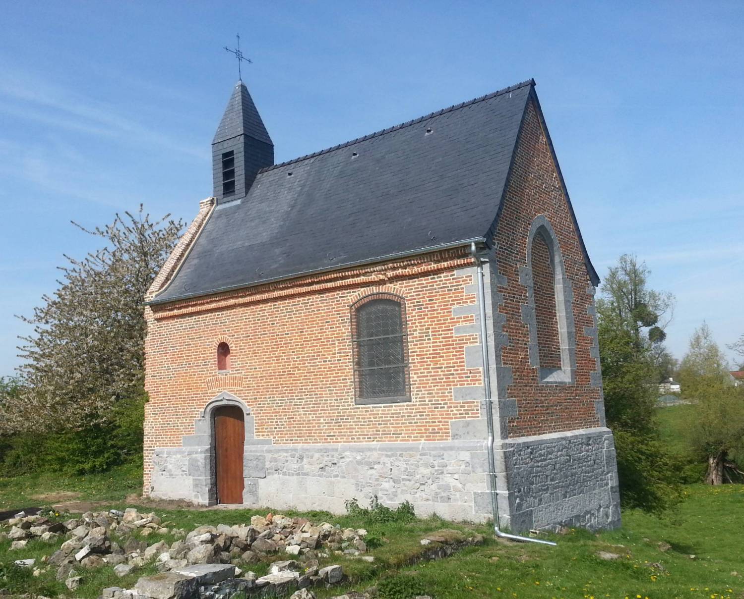 Aujourd’hui isolée, la chapelle est une construction très simple, qui doit son caractère à ses proportions et à ses matériaux, briques de belle couleur orangée pour les élévations, pierre bleue du Hainaut pour les soubassements, les angles et les encadrements. La présence d’un arc profilé en accolade rappelle combien la tradition gothique demeura vivante jusqu’au xviie s. dans cette terre des Pays-Bas espagnols, rattachée en 1678 seulement au domaine royal.
