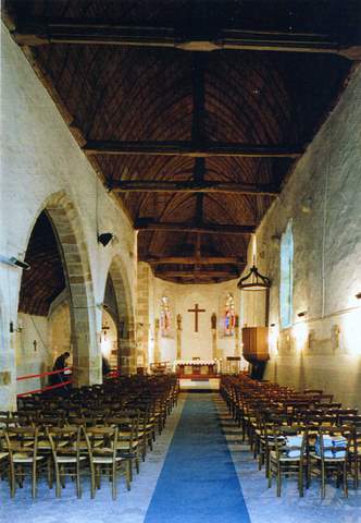À l’intérieur, la nef, le chœur ainsi que le bas-côté sont couronnés d’un lambris en arc brisé. La charpente apparente est ornée de sculptures variées ; on relève des dates : 1635 sur la voûte, 1556 et 1573 sur des poutres. Les ouvertures sont en arc brisé ; celles du chœur et de la chapelle possèdent quelques fragments d’anciens vitraux. Les arcades qui séparent la nef principale du bas-côté reposent sur des piles octogonales.