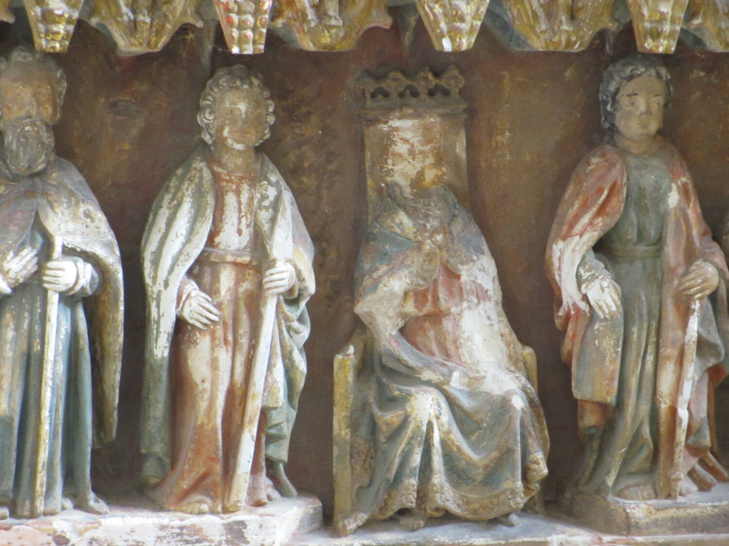 Révolution. Ce retable, ainsi que d’autres éléments en bois provenant de celui-ci, ont été réinstallés en 1927 dans l’église, où des restaurations ont eu lieu dans les années 60-70. Ces interventions avaient permis de restaurer la polychromie et de combler certaines lacunes avec du plâtre fin. Cependant, ces restaurations anciennes montrent aujourd’hui des signes de dégradation, notamment sous l’effet de l’humidité, et nécessitent des travaux pour stabiliser l’ensemble et préserver sa polychromie d’origine.