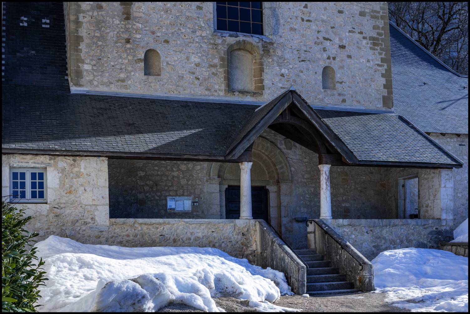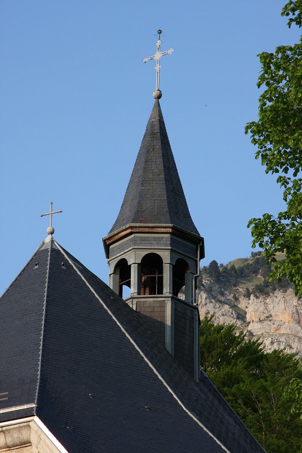 L’église, voûtée d’ogives, est couverte d’une toiture à haut comble de style cartusien en ardoises.
