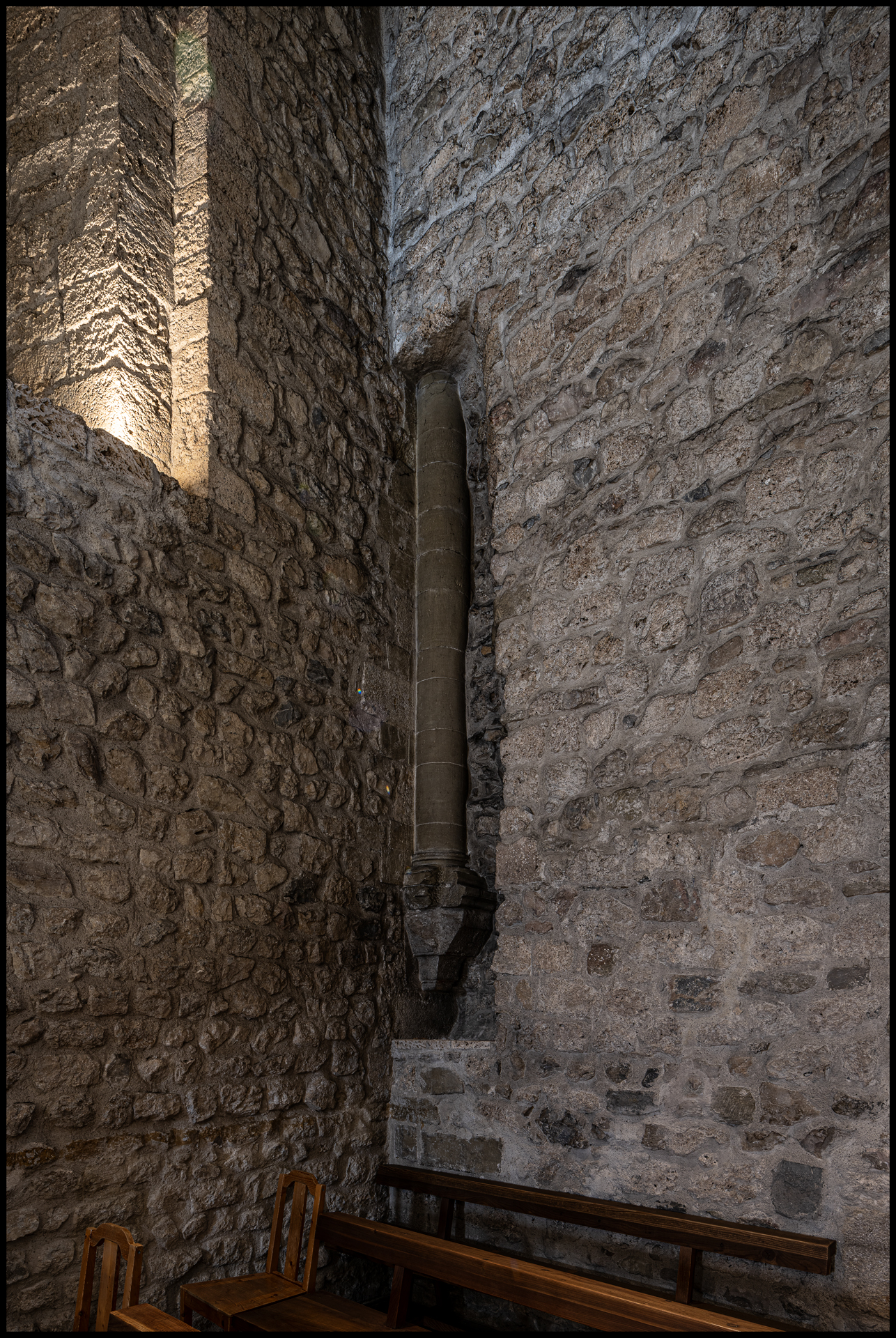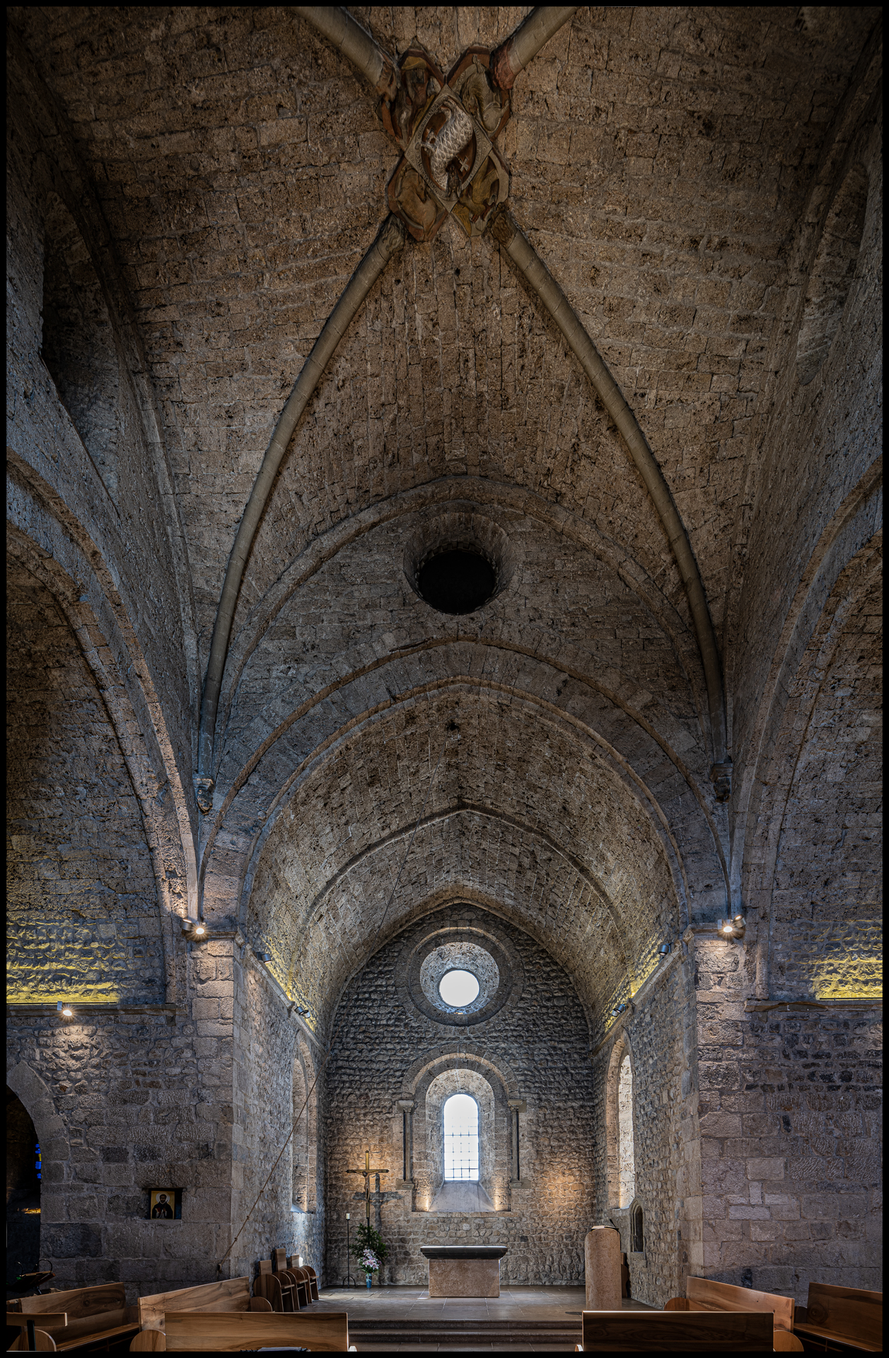 Elevée au début du XIIe siècle en moellons locaux, solides mais difficiles à tailler, l’église en croix latine est voûtée mais extrêmement sobre, dépourvue de toute ornementation.
