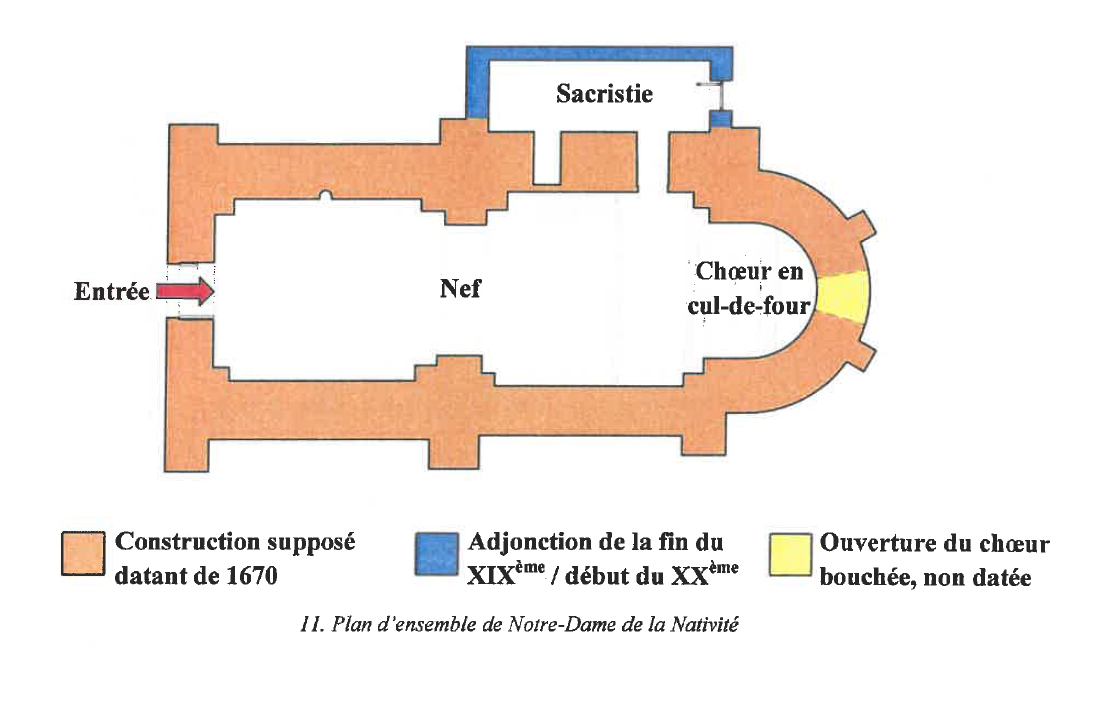 Au XVIe siècle Notre-Dame de la Nativité subit les assauts et les dégradations des Huguenots. Elle ne fut reconstruite que vers 1670. En 1690, au cours de sa visite pour le compte de Mgr. Fléchier, l’abbé Robert note que l’église est en bon état mais qu’elle n’a pas de cloche.