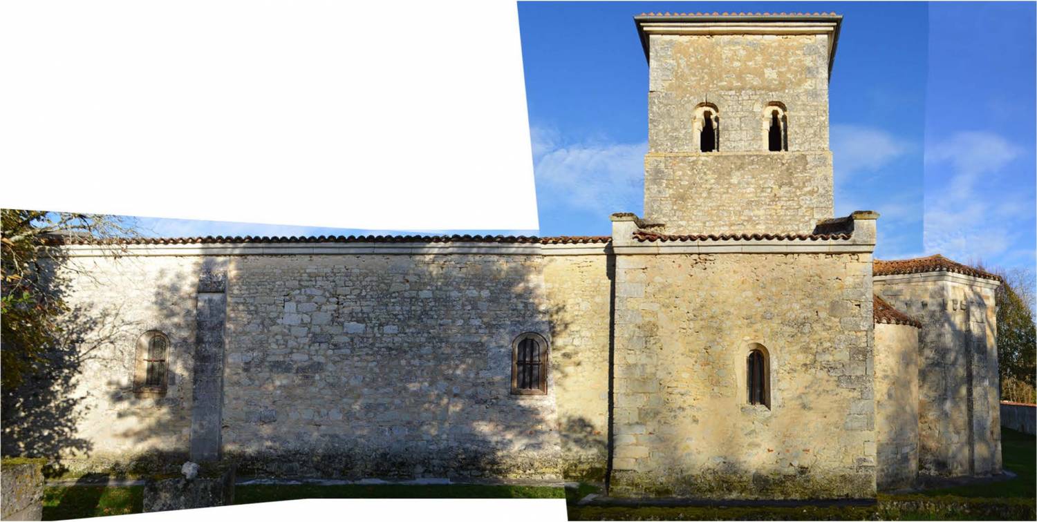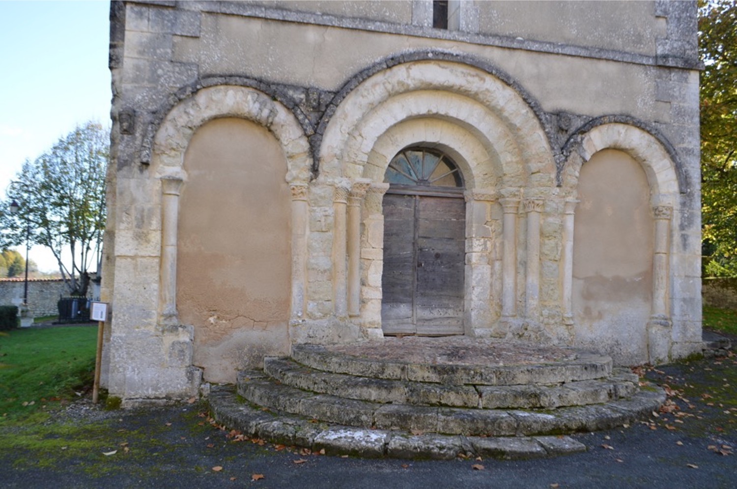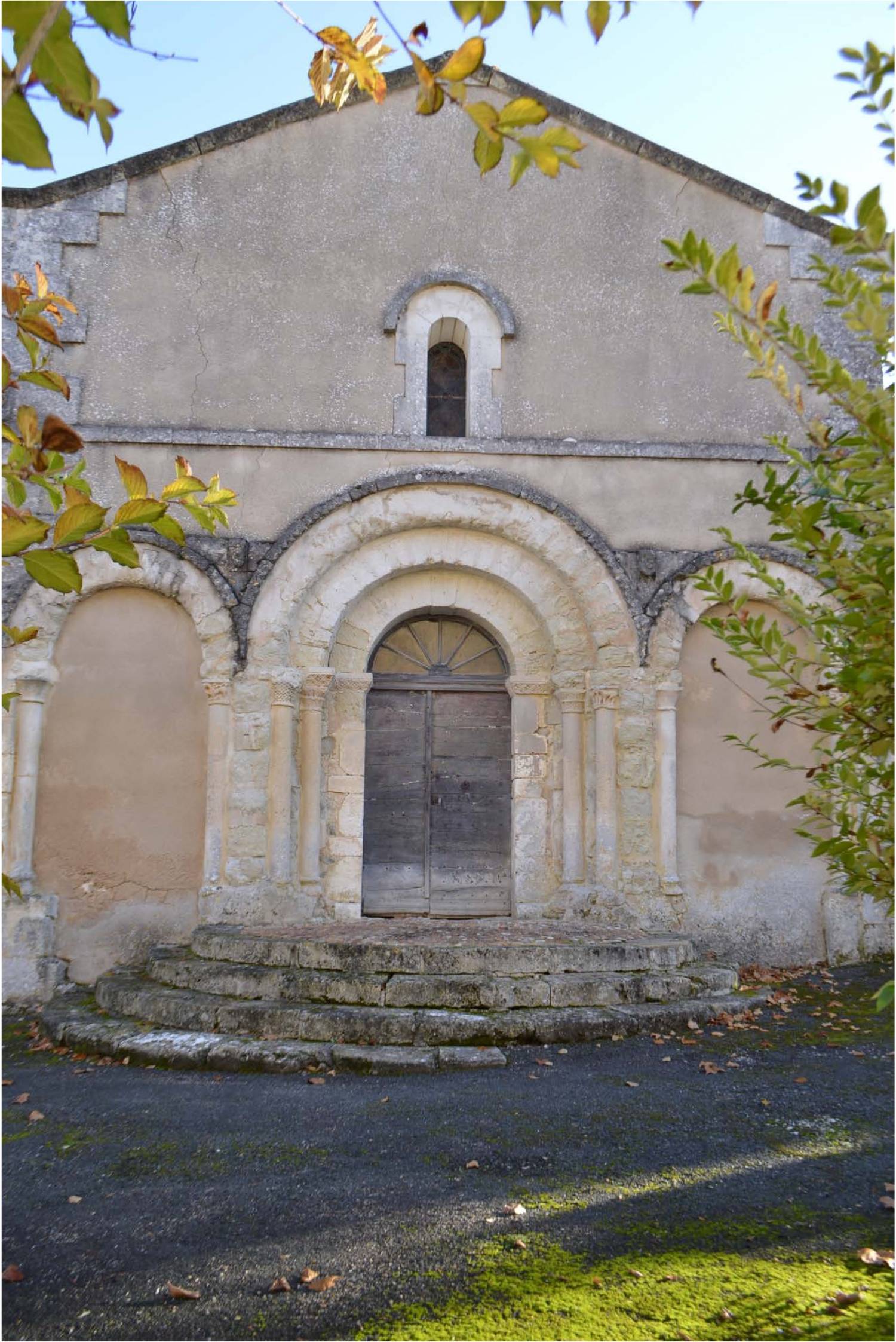 La nef forme un rectangle de 6 x 14m, dont il ne subsiste comme élément roman à l‘extérieur, que la partie basse de la façade occidentale, d’esprit saintongeais, et que l’on peut situer du milieu du 12ème siècle. Le portail est à triple voussure, encadré de deux baies aveugles à une seule voussure. Celles-ci retombent sur des colonnettes dont les chapiteaux comportent des décors très soignés d’esprit saintongeais également. Les tailloirs des chapiteaux sont à motifs géométriques, et les archivoltes qui coiffent les arcatures sont à décor de têtes de clous. La partie haute de la façade est du 19ème siècle.