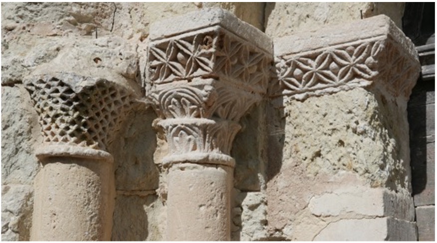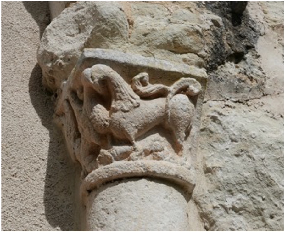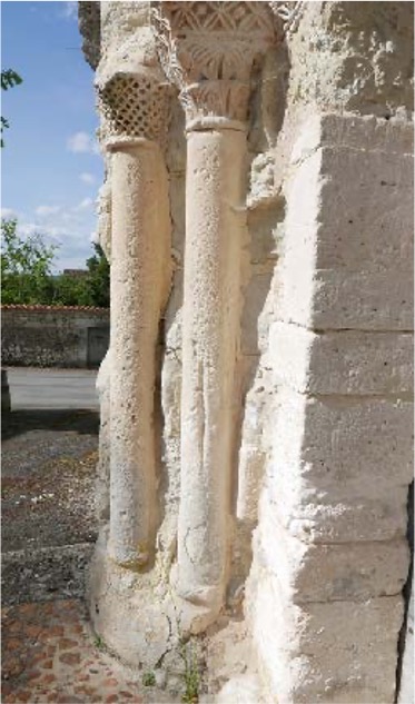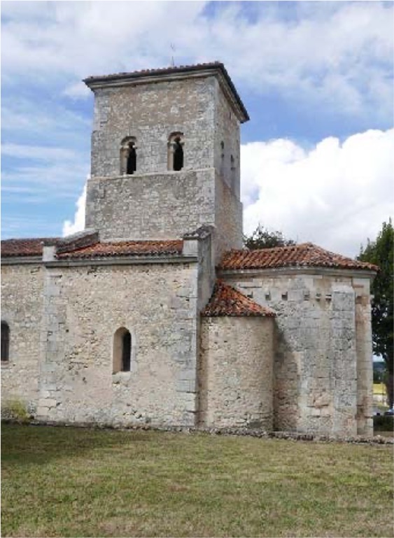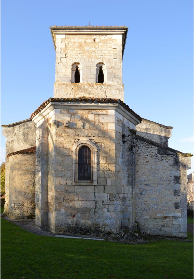 L’abside romane, est polygonale à l’extérieur, le polygonale curieusement pincé à la jonction avec la base du clocher, et bâtie bel appareil de grands modules, avec deux contreforts plats sur les pans biais.